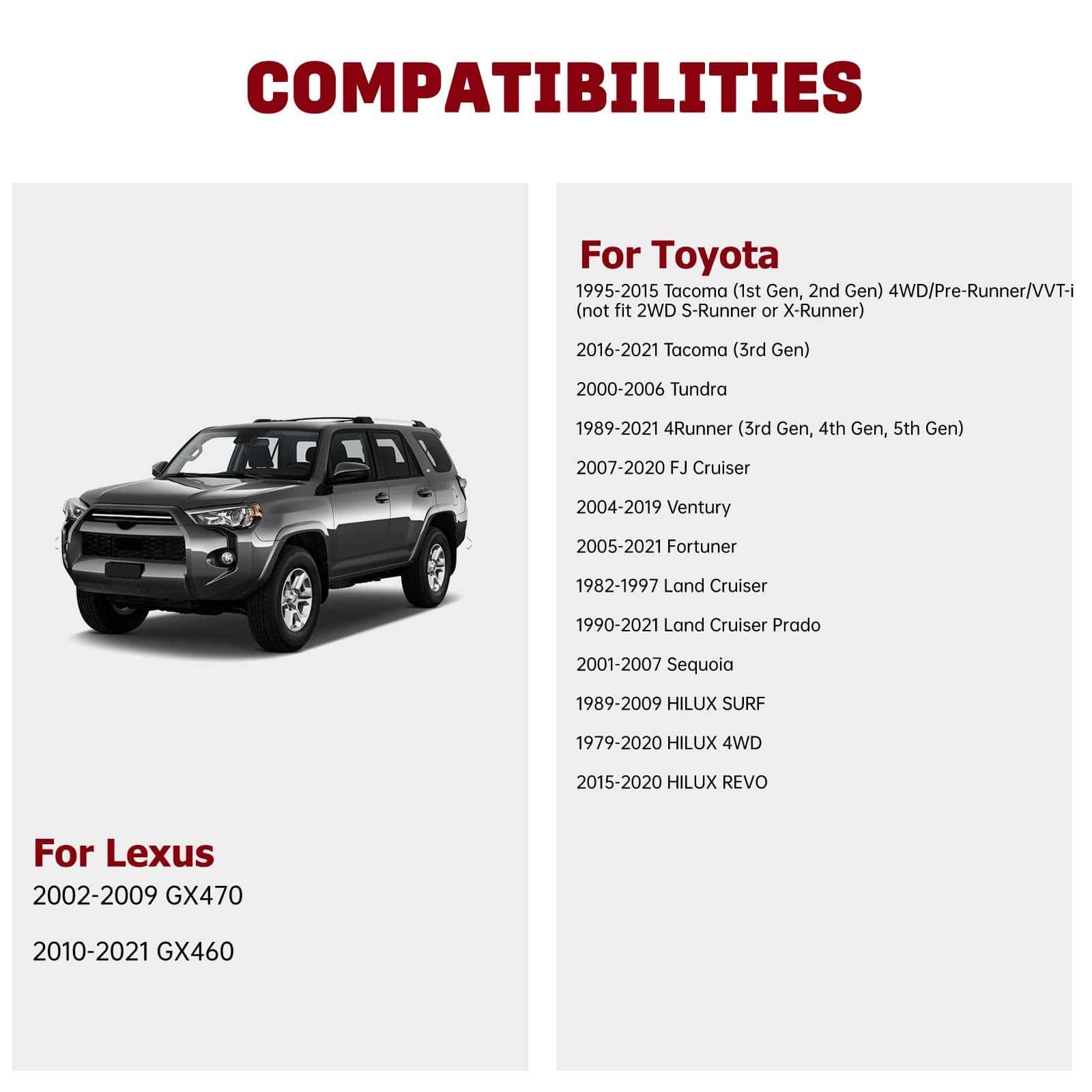 1. Ajuste – Adaptador de separadores de 6×5.5 a 6×5.5 106mm adecuado para 4Runner 1989-2021 | Para Tacoma 1995-2015 (1ra generación, 2da generación) 2016-2021 (3ra generación) | Para Tundra 2000-2006 | Para FJ Cruiser 2007-2020 | Para Ventury 2004-2019 | Para Fortuner 2005-2021 | Para Land Cruiser 1982-1997 | Para Sequoia 2001-2007 | Para GX470 2002-2009 | Para GX460 2010-2021 y más.