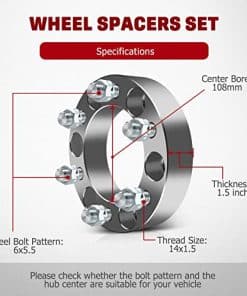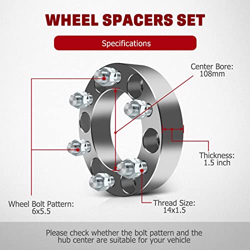 Wheel Spacers adoptan Aluminio 6061-T6 y se fabrican mediante Tecnología de Procesamiento CNC Automático. Mide con precisión los cubos y el orificio de la rueda para adaptarse al vehículo con el espacio mínimo, reduce eficazmente el balanceo del vehículo, evita cualquier vibración, incluso durante los derrapes y giros bruscos, puede bloquear firmemente los neumáticos, asegurar la estabilidad y seguridad al conducir. Espesor: 1.5 pulgadas, Patrón de pernos del vehículo: 6×5.5, Patrón de pernos de la rueda: 6×5.5, Centros: 108mm, Tamaño de rosca: 14×1.5, Color: Plateado. Incluye 4 separadores de rueda, 24 pernos de alta resistencia (pernos de grado 10.9 y tuercas forjadas tratadas con calor T8). Requiere herramientas estándar de reparación de neumáticos, llaves de torsión y cubos de pernos; Antes de la instalación, equilibre la rueda, limpie el polvo o la suciedad y ajuste los pernos de acuerdo con el estándar del fabricante. Vuelva a apretar todos los pernos después de conducir 50-100 millas, y luego vuelva a apretar después de conducir 2000-3000 millas. GDSMOTU Ofrece un Servicio Satisfactorio — Nuestra tienda ofrece separadores de rueda de 4 pernos/5 pernos/6 pernos/8 pernos. Debe haber un vehículo adecuado para usted porque somos una tienda de piezas de automóvil profesional. Por favor seleccione los Separadores de rueda adecuados con el año, marca y modelo correctos.