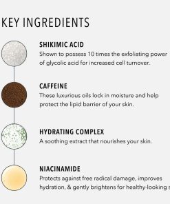 1. Limpia, Ilumina y Exfolia: Este gel de baño que induce luminosidad utiliza el poder revitalizante de la cafeína junto con ácido shikímico, un exfoliante químico suave altamente efectivo con 10 veces la actividad biológica del ácido glicólico, para nutrir profundamente y rejuvenecer visiblemente la piel.