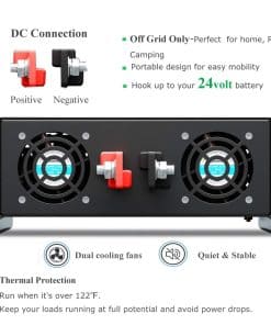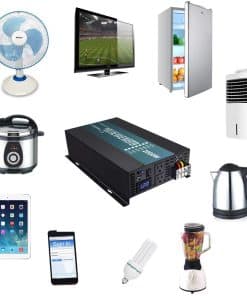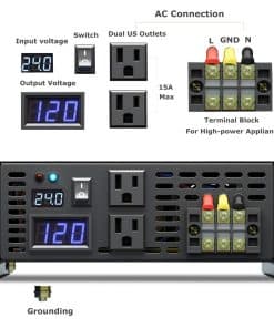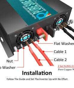 Acerca de nosotros: br Fabricante profesional de inversores de onda sinusoidal pura durante 8 años. Fábrica original, ofrecemos precios razonables, alta calidad y una rápida respuesta a sus preguntas dentro de las 24 horas. br br Detalles del producto: br Entrada de CC: 24V br Rango de entrada de CC: 21V-30V br Consumo de corriente en vacío: 1.5A br Eficiencia: 85%-90% br Voltaje de salida de CA: 120V br Regulación de CA: 3% br Frecuencia: 60Hz br Enchufe: Tipo de EE. UU. de 15 amperios Alarma de voltaje bajo: 19.5V-21.5V br Apagado por voltaje bajo: 18.5V-20.5V br Sobrecarga: apagado, recuperación manual br Apagado por sobre voltaje: 30.5V br Sobrecalentamiento: Apagar salida automáticamente, protección contra sobretensión br Formas de enfriamiento: El ventilador de enfriamiento funcionará cuando la temperatura supere los 50 grados br br Precauciones: br 1. Utilice los cables de batería estándar que enviamos, de lo contrario, la potencia de salida completa no está garantizada. Y los fusibles son solo piezas de repuesto. br 2. No conecte el inversor con la energía de la red, y la conexión inversa de positivo y negativo también está prohibida. br 3. No sobrecargue. Si sus aplicaciones son cargas inductivas, elija inversores cuya potencia continua sea de 3-7 veces mayor que los vatios de sus electrodomésticos. Si desea encender un refrigerador, le sugerimos que use un inversor con 10 veces más potencia. br 4. Apague la carga primero y luego apague el inversor. Y como hay una función de inicio suave, encienda el inversor primero y luego encienda su carga, o la salida puede no ser estable en los primeros segundos. br 5. Para una luz roja intermitente, es un recordatorio para informarle que el voltaje de entrada es un poco alto, puede hacer caso omiso de ello. Si la entrada es demasiado alta, el inversor se apagará automáticamente. br 6. El voltaje de salida se puede ajustar en un rango pequeño. br