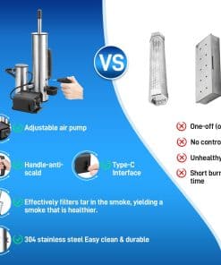 Este mini generador de humo eléctrico de acero inoxidable es práctico y no ocupa mucho espacio, equivalente a tener un pequeño ahumador de pellets, no necesitas comprar un ahumador grande y voluminoso. Agrega tu mezcla favorita de trozos de madera o virutas para personalizar el perfil de humo, como cereza, nogal, mezquite, manzana, pacana para agregar diferentes sabores. Los tubos de humo para parrillas de pellets funcionan bien durante hasta 5-12 horas de humo envolvente, perfecto para necesidades de ahumado caliente y frío. ¡Casi humo instantáneo! Ya sea que desees ahumar filetes, pollo, hamburguesas y cerdo caliente en la parrilla o ahumar en frío cócteles, nueces, galletas o quesos, etc. Los accesorios para ahumadores queman las virutas de madera y dan un buen sabor, ¡devolverán el anillo de humo a tu comida deliciosamente sabrosa pero con un sabor «ahumado»! El favorito de los maníacos del humo! Que funcionará de maravilla con cualquier parrilla! Conviértelos en ahumadores de pellets en poco tiempo. Ajuste a todas las parrillas y parrillas de pellets, incluidas las planchas Blackstone, parrillas Weber, parrillas Ninja, horno de pizza, parrillas de pellets, ahumadores, hornos de mesa, estufas para acampar, etc. Mejor sellado, pondrá toneladas de humo en tu parrilla para que tu comida sepa mejor. Te encantará la cantidad de humo que este aparato generar. Adecuado para asados al aire libre, acampadas, eventos deportivos, terrazas, patios. Este tubo ahumador de pellets está diseñado con múltiples tuberías para separar el aceite, filtra eficazmente alrededor del 80% de la humedad y alquitrán en el humo. Esto supera a los tubos ahumadores tradicionales teniendo en cuenta la salud, produciendo un humo más saludable. Y que el aceite de humo no evitará que las virutas de madera se quemen. La bomba de aire soporta puerto de alimentación tipo-c, puedes usarlo inmediatamente después de conectarlo a una fuente de alimentación móvil. Utilizamos acero inoxidable de primera calidad, mientras que el silicona en las asas y la tapa pueden estar aislados. Después de usarlo, simplemente abre la tapa del tubo y vierte las cenizas y el aceite de humo. Con esto puedes ahumar alimentos de forma más conveniente en cualquier momento, y además puedes mejorar aún más los alimentos que ahumas. ¡Será el mejor accesorio para tu barbacoa ahumada al aire libre!