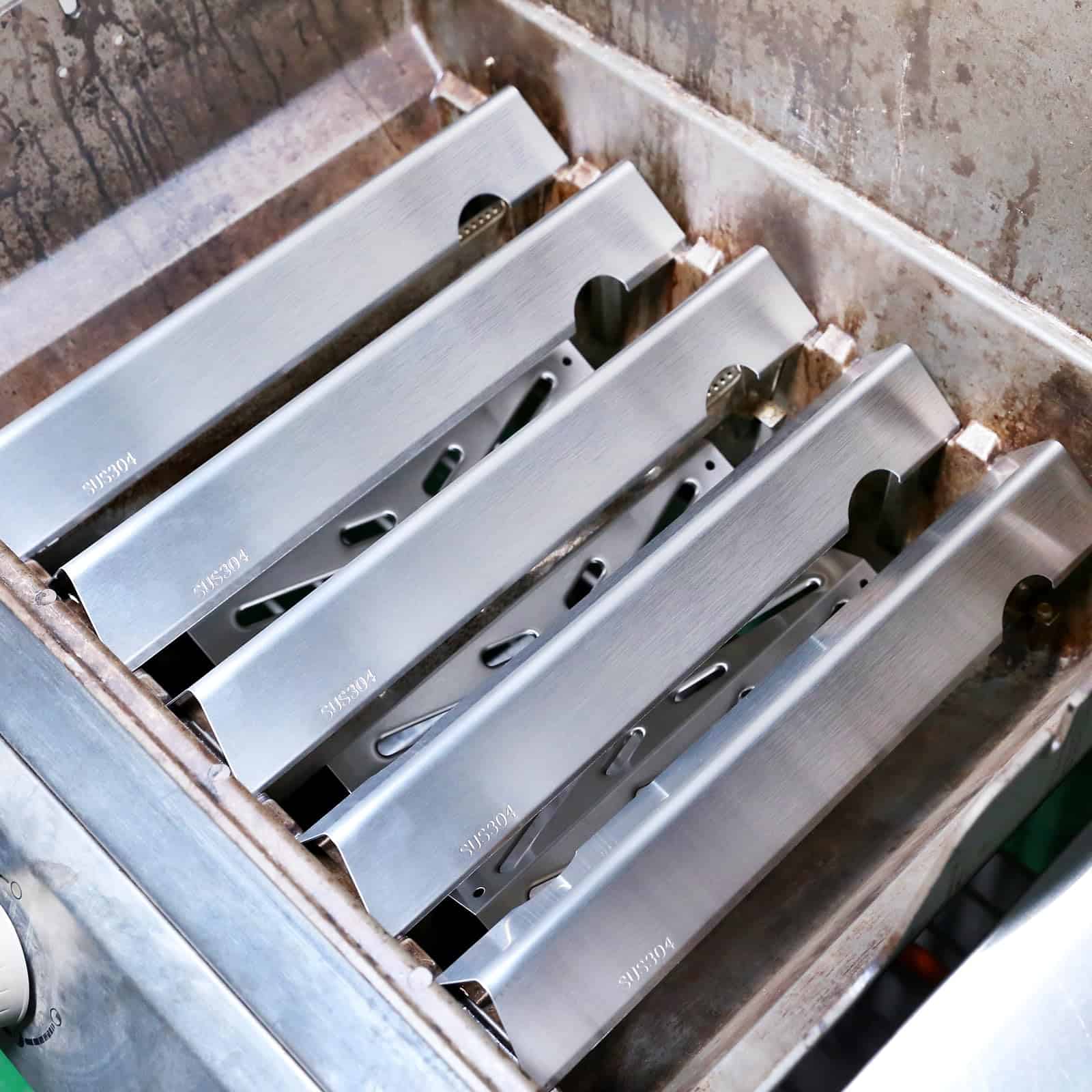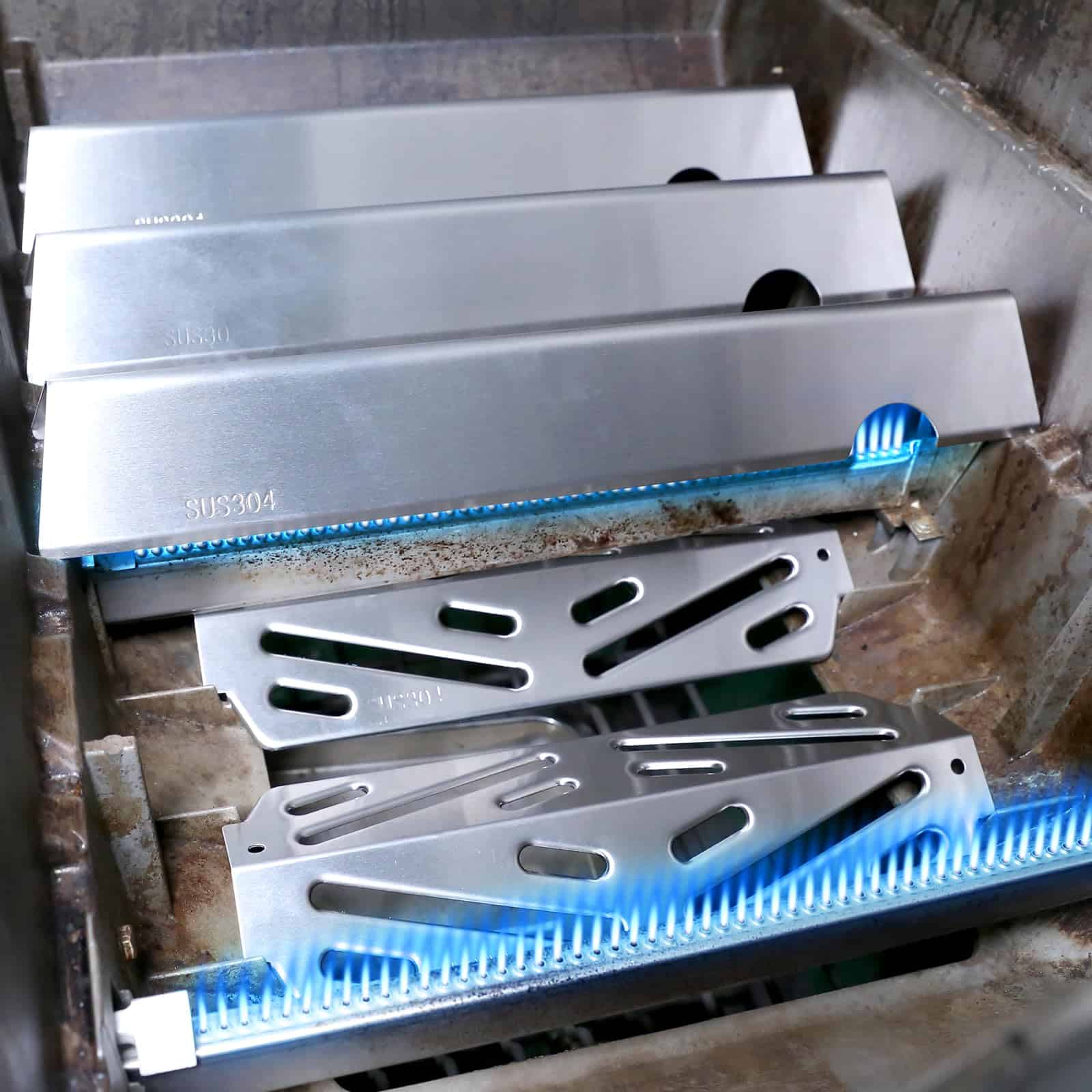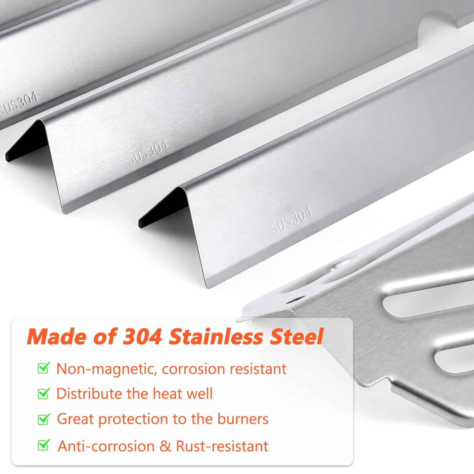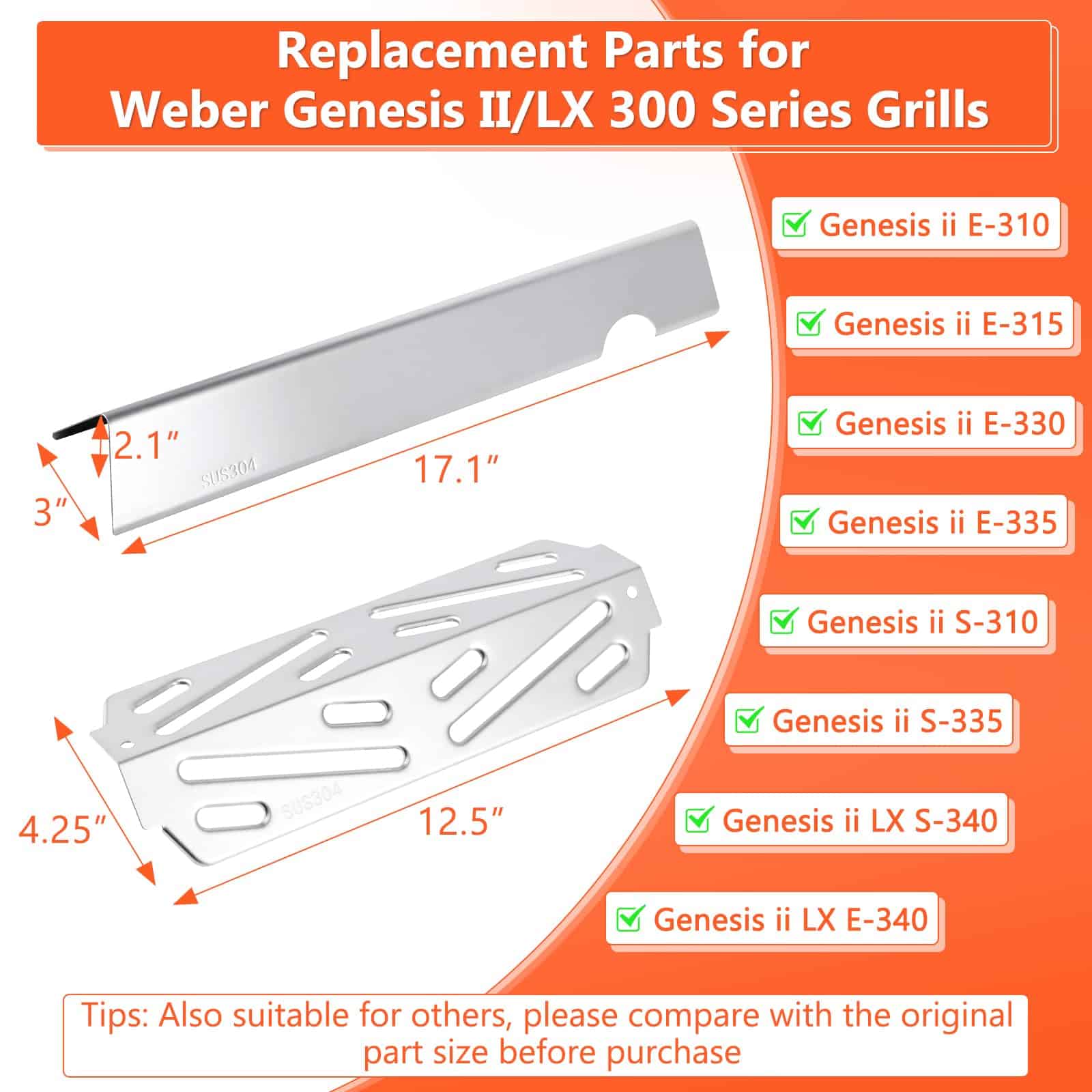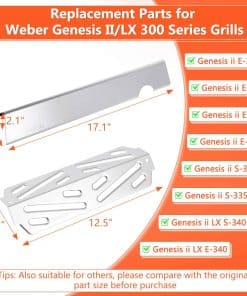 1. Acero inoxidable premium SUS304 no magnético Crafted hecho de acero inoxidable 304 resistente, estos bañeras de sabor y deflectores de calor son no magnéticos y diseñados para una excelente resistencia a la corrosión y al calor. Una actualización confiable para sus bañeras Genesis II y deflectores de calor Genesis II de Weber. 2. Dimensiones Cada barra mide 17 1/8″ x 3″ x 2 1/8 (L x A x H). Cada deflector de calor mide 12.5 x 4.25 pulgadas / 12-1/2″ x 4-1/4″ (L x A). Conjunto de 5 placas de calor de acero inoxidable 304 y 3 deflectores de calor de acero inoxidable 304. Por favor, compare amablemente con el TAMAÑO y MODELO de sus piezas originales antes de hacer el pedido. 3. Se ajusta a las parrillas de la serie Weber Genesis II 300 Estas bañeras Genesis II y deflectores de calor Genesis II para Weber Genesis II E-310, Genesis II S-310, Genesis II SE-310, Genesis II E-315, Genesis II E-325, Genesis II E-330, Genesis II SE-330, Genesis II CE-330, Genesis II S-335, Genesis II SE-335, Genesis II E-335, Genesis II S-345 (2017 en adelante). Reemplace las barras de sabor 66032, 66795 de Weber. 4. Se ajusta a las parrillas de la serie Weber Genesis II LX 300 Las piezas de genesis ii e-310 para Weber Genesis ii LX S-340, Weber Genesis ii LX E-340, Weber Genesis ii CSE-315, Weber Genesis ii CSS-315, Weber Genesis ii CSS-335, Weber Genesis ii CSE-335, Weber Genesis ii LX CSS-340, Weber Genesis ii LX CSE-340 (2017 en adelante). Reemplace las piezas de accesorios de parrilla GS4 Parts 66795 66032 66685 66040 de Weber. 5. Una alternativa confiable a las barras de porcelana A diferencia de las barras recubiertas de porcelana que pueden astillarse y corroerse con el tiempo, estas sólidas barras de sabor de acero inoxidable SUS304 ofrecen un rendimiento duradero sin la preocupación de que los recubrimientos se despeguen. Una elección inteligente para mejorar la durabilidad de su parrilla y reemplazar las partes desgastadas de la parrilla Genesis 2 de Weber. 6. Aviso importante Antes de realizar una compra, mida sus barras de sabor o deflectores de calor existentes. Si no está seguro, no dude en contactarnos para obtener información detallada. En caso de no uso a largo plazo, recubra completamente el producto con aceite para cocinar y envuélvalo en una bolsa de plástico o papel manteca para su almacenamiento adecuado.