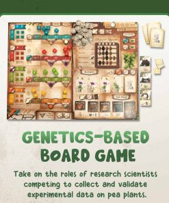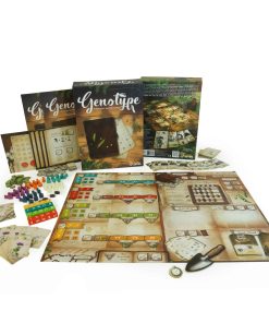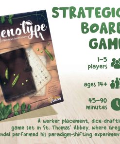Genotipo: Un Juego de Genética Mendeliana es un juego de colocación de trabajadores y selección de dados para 1-5 jugadores que dura aproximadamente de 45 a 75 minutos. Como científicos de investigación en la Abadía de San Tomás, donde Gregor Mendel descubrió la genética moderna en el siglo XIX, se te asigna validar los rasgos genéticos de tus plantas de guisante para anotar puntos. Las rondas se centran en la selección de dados, donde cuadros de Punnett y hermosos dados personalizados se utilizan para determinar qué genes dominantes y recesivos estarán disponibles para la siguiente generación de plantas. Pero tendrás muchas oportunidades antes y después de cada selección para pagar recursos y colocar trabajadores para mejorar tus posibilidades. Manipula los cuadros de Punnett para aumentar tus chances, o disminuir las chances de otros jugadores, de que aparezcan fenotipos específicos. Mejora tu jardín, determina tu orden de selección, compra cartas de herramientas de un solo uso y contrata a otros miembros de la Abadía como Asistentes poderosos para aumentar tus posibilidades de ganar. El dinero es escaso en Genotipo y cada decisión es importante, así que espera una estrategia profunda y una dura competencia en este juego de genética mendeliana.
