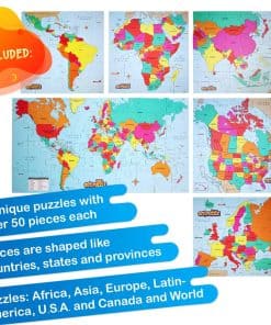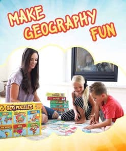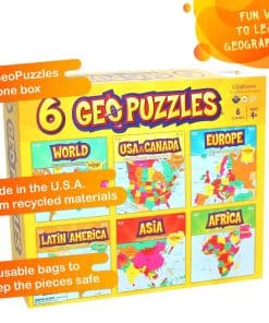 Desde Afganistán hasta Zimbabue, el galardonado GeoPuzzle Set de 6 Puzzles de GeoToys ofrece la alegría de aprender sobre el mundo al alcance de los niños. Regale el regalo de entender nuestro complejo mundo. El set GeoPuzzle tiene 6 rompecabezas únicos con más de 50 piezas cada uno. Las piezas tienen forma de países, estados y provincias. Los niños aprenden el nombre y la forma de una zona, y también aprenden su ubicación en un mapa. Se incluye un mini póster de cada rompecabezas para ayudar en el ensamblaje. De tamaño gigante, estos rompecabezas son geniales en mesas grandes en aulas y se utilizan como rompecabezas de suelo en casa, escuela y campamento. Fabricados en EE. UU. con materiales reciclados para fomentar la sostenibilidad en juguetes para niños. Los premiados GeoPuzzles son increíbles Juegos Educativos. Los niños: