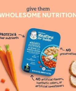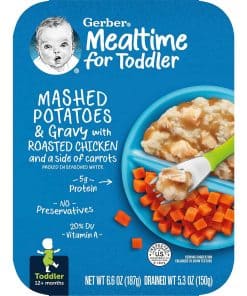 Gerber Lil’ Entrees Puré de papas y salsa con pollo asado con zanahorias es una comida conveniente para niños pequeños. Es tan deliciosa como nutritiva, proporcionando una porción completa de verduras. Además, los Gerber Lil’ Entrees no necesitan nevera. Lo preparamos y sellamos la bandeja de manera segura con amor. Primero, combinamos nuestros ingredientes y los sellamos firmemente. Luego lo cocinamos cuidadosamente durante el tiempo adecuado para un sabor y textura que a los niños les encantará, sin conservantes ni sabores artificiales. Su niño pequeño puede estar listo para esta comida si: Se mantiene solo y comienza a caminar solo, se alimenta fácilmente con los dedos o muerde a través de una variedad de texturas. Instrucciones de preparación: Saque la bandeja del cartón y perfore el sellado en ambas compartimentos; Caliente en el microondas durante 30 segundos; Tire con cuidado del sello desde la pestaña de extracción en el extremo del compartimento pequeño justo lo suficiente para drenar el líquido; Después de drenar, retire el sello de toda la bandeja y deséchelo; Revuelva el contenido y pruebe la temperatura antes de servir; Cubra y refrigere después de abrir; Deseche la porción no utilizada después de 2 días.