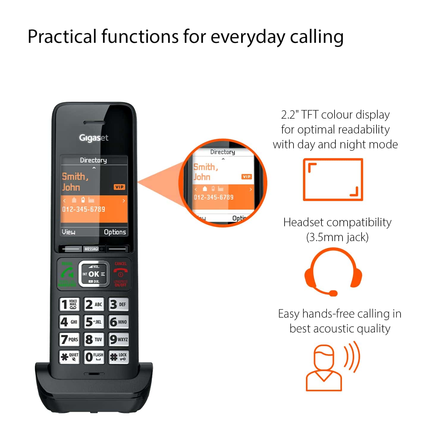 2. CARACTERÍSTICAS CONVINCENTES – Llamadas telefónicas y conversaciones con manos libres en calidad brillante de alta definición – Compatibilidad con auriculares a través del conector de 3,5 mm – Protección de llamadas de confort para 150 números – Agenda para hasta 200 entradas.