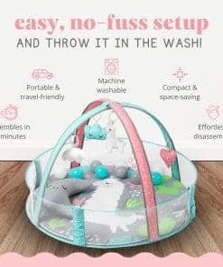 EXTRA GRANDE Y SUPER CÓMODO! La alfombra de actividades para bebés Toddletuff proporciona un espacio de juego más grande y seguro para que el bebé se dé la vuelta y se siente. Está hecha con tejidos de alta calidad con un anillo exterior grueso, segura y cómoda para la piel del bebé. La parte trasera es antideslizante para evitar deslizamientos en el suelo