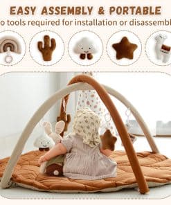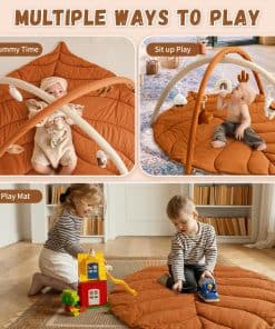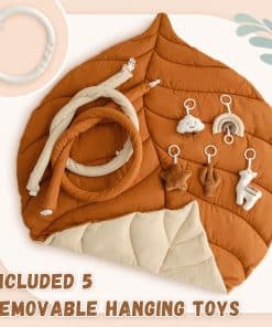Gimnasio de Juegos para Bebés con Alfombra en Forma de Hoja es la opción perfecta para estimular el desarrollo de tu pequeño. La alfombra es gruesa y ampliada, lo que proporciona un espacio cómodo y seguro para que tu bebé pueda jugar y descansar. Los arcos son removibles, convirtiendo la alfombra en un lugar ideal para que el bebé se divierta sin restricciones. Además, la neutralidad del color marrón de la alfombra se adapta fácilmente a la decoración de tu hogar y es fácil de instalar y limpiar. El centro de actividades para bebés cuenta con 6 juguetes colgantes coloridos que estimulan la visión, audición y tacto del bebé, fomentando así sus habilidades motoras y coordinación mano-ojo. Este gimnasio de juegos para bebés es portátil, lo que lo hace perfecto para llevarlo contigo cuando viajes o para moverlo fácilmente por toda tu casa. Haz que cada momento de juego sea especial para tu bebé con este increíble gimnasio de juegos para bebés.