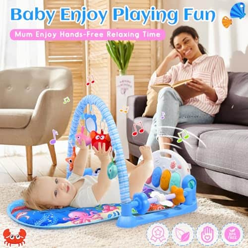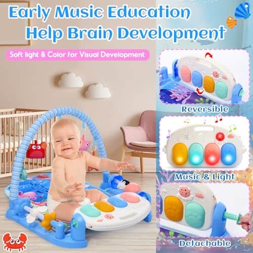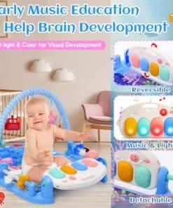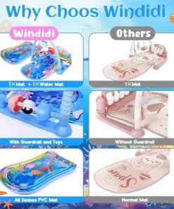 Gimnasios para bebés Alfombras de juego con Tapete de Agua para Tiempo Boca Abajo, Alfombra de Actividades para Bebés con Piano de Juego y 5 Juguetes Sensoriales para Bebés, Música y Luces Regalos para Niño y Niña Recién Nacidos 0-3 4-6 6-9 6-12 Meses. El gimnasio para bebés Windidi cuenta con un tapete de agua desmontable y un gimnasio de piano de juego, añadiendo una capa extra de diversión y comodidad. Utilice la alfombra de juego suave para el tiempo boca abajo diario o coloque la almohadilla de agua inflable para una experiencia fresca y rica en estímulos sensoriales. El tapete de agua proporciona una experiencia táctil, ayudando a su bebé a desarrollar habilidades motoras mientras se mantiene fresco y entretenido. Perfecto para el tiempo boca abajo, gatear o jugar, este gimnasio para bebés está diseñado para crecer con su bebé desde recién nacidos hasta niños pequeños. Ideal para bebés y niñas de 0 a 6 meses, un gran juguete de aprendizaje temprano para recién nacidos e infantes. El tapete de agua inflable proporciona un efecto refrescante y suave, haciendo que el tiempo boca abajo sea más agradable y previniendo molestias por el calor. Simplemente llénelo de agua para crear una superficie suave y acolchada ideal para actividades de verano para bebés. La proyección de luz de estrella única y las teclas del piano iluminadas suavemente capturan la atención de su bebé, fomentando el toque y la exploración. El gimnasio para bebés presenta un piano activado con patada con 3 modos atractivos: notas altas, notas bajas y cuatro melodías incorporadas, proporcionando una iniciación musical temprana. Diseñado para bebés, este gimnasio para bebés es respetuoso con el medio ambiente y SIN BPA , las alfombras de juego PP son suaves y lavables donde el bebé puede acostarse o jugar incluso cuando está desnudo. El proceso de montaje también es muy simple. Nuestro gimnasio para bebés y tapete de agua alardea de diversión, comodidad, versatilidad, colores ricos y formas diversas, estimulando la creatividad e imaginación en recién nacidos y bebés de 0-3 4-6 6-9 6-12 meses. Diseñado para crecer con su bebé, es un regalo pensado y encantador para baby showers, cumpleaños, Navidad y otras ocasiones especiales. ¡Una sorpresa perfecta para recién nacidos y padres por igual!
