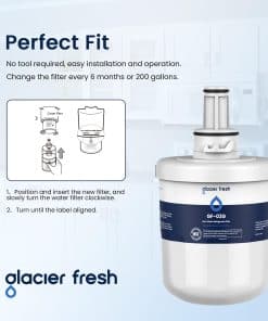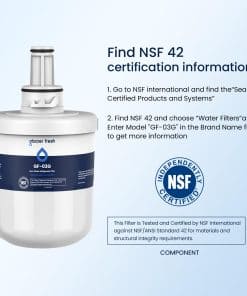 GLACIER FRESH GF-03G Repuesto para Filtro de Agua Samsung: Material y Construcción probados para cumplir con las normas NSF42. Probado y verificado por pruebas de laboratorio independientes, el filtro de agua para refrigerador GF-03G de Samsung elimina el 97.9% de cloro y mejora el olor y sabor del agua.