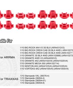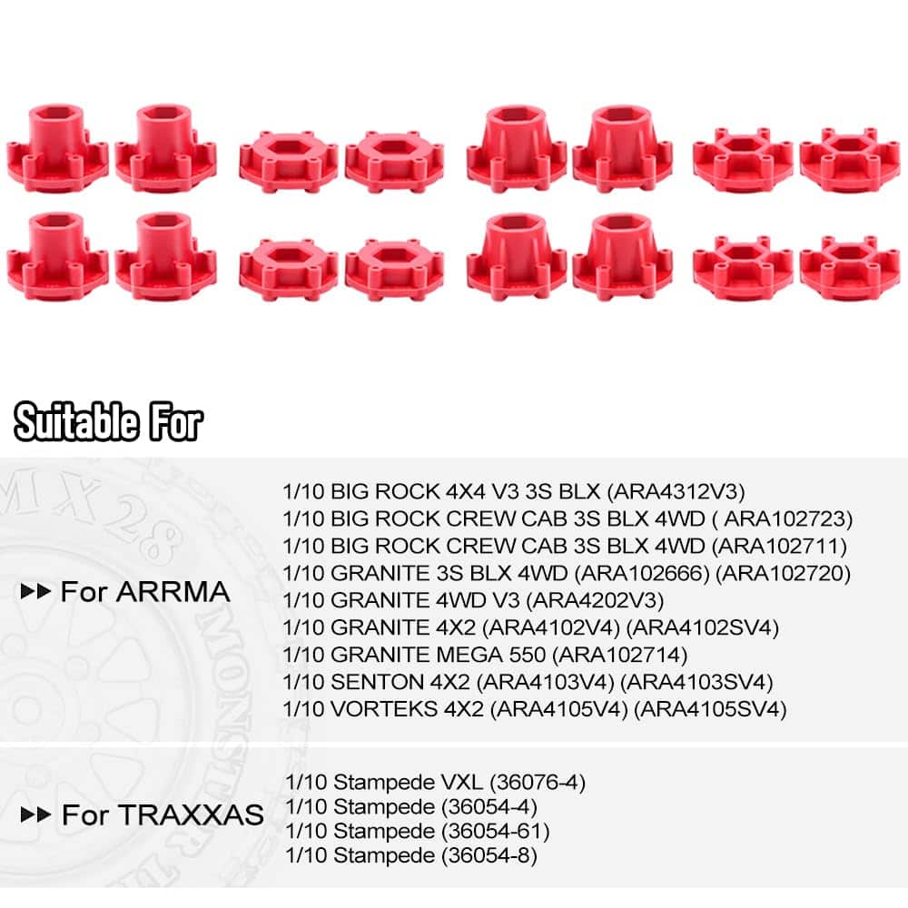 Puedes pasar rápidamente y fácilmente desde el offset estrecho de 12mm incluido (2WD Stampede/Rustler trasero) a los hexágonos de offset ancho de 12mm incluidos (2WD Stampede/Rustler delantero y 4WD Stampede/Rustler delantero y trasero) o hexágonos de rueda de 14mm (Granite 3S, Big Rock 3S).