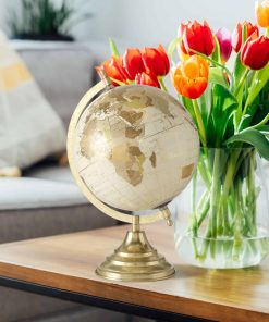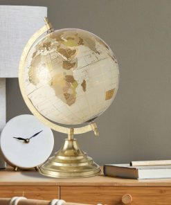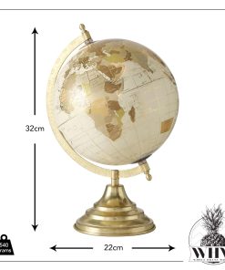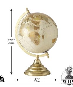 Whisper worldly into a room with this modern classic spin-able globe. This artful rendition is made with meticulous detailing of locations, latitude and longitude lines that offer scholarly vibes from days gone by to any shelf or mantel. Crafted of mixed materials, the globe is made of cast resin and covered in ivory with gold mapped details. The base is made of durable iron finished in gold and fitted with a crescent holder. Well sized, the overall size of this piece measures as follows: 8.75 D x 12.5 H inches, 1.25 lbs (22 D x 32 H cm, 540 grams) Sleek and sophisticated, let this fine piece add an eye catching accent to a desk, coffee table, bookshelf or tray-top arrangements. Loaded with inquisitive spirit and inspiration, this handsome piece is a welcome gift for many occasions.
