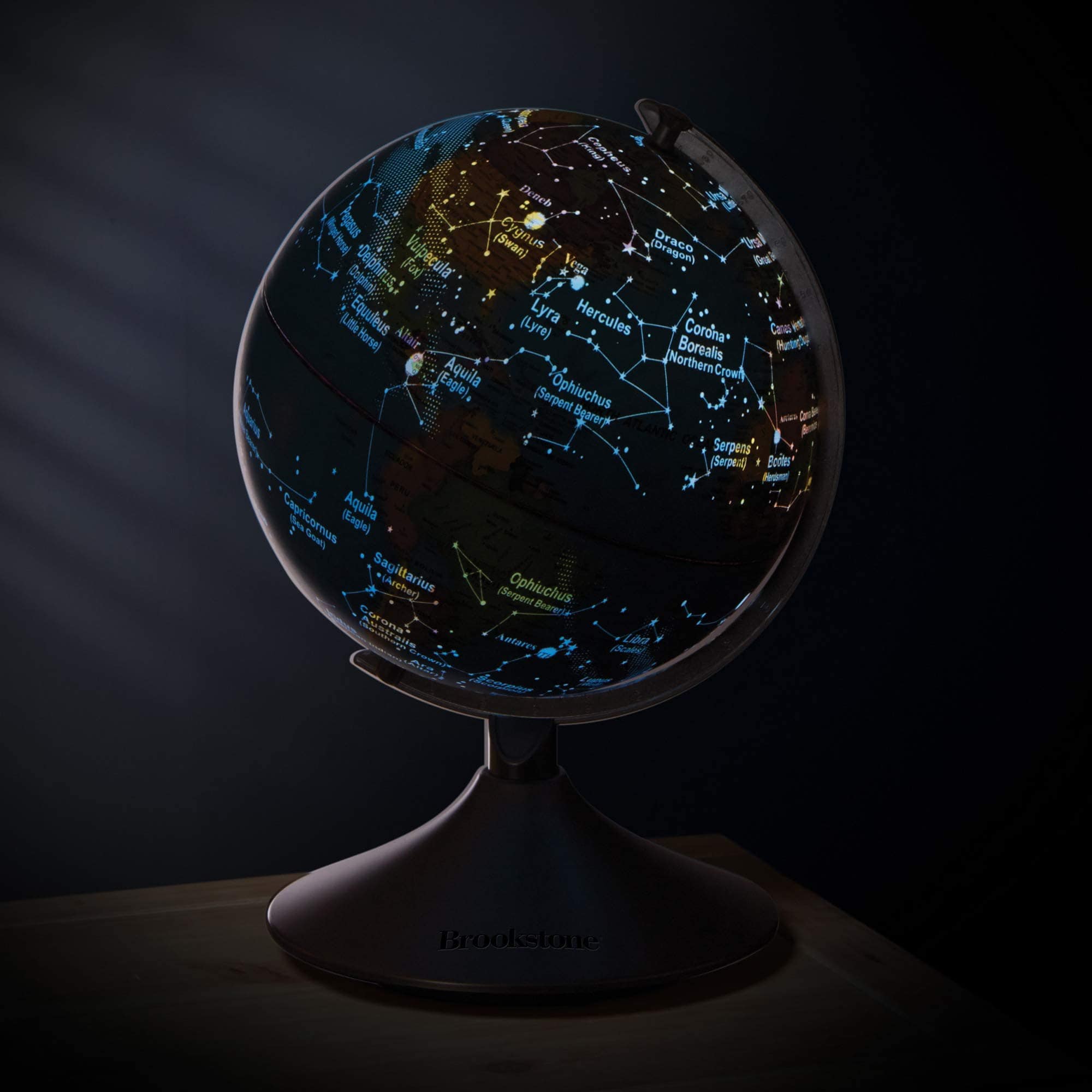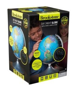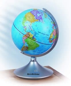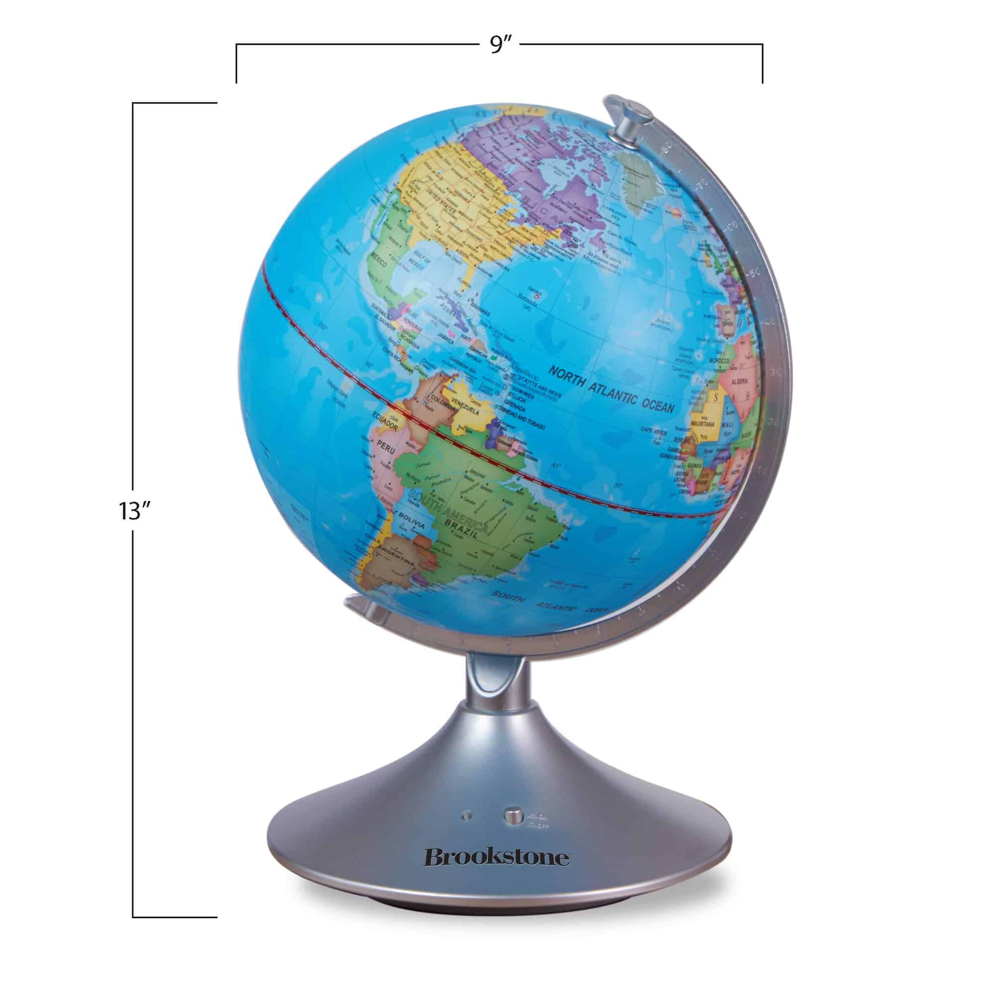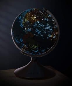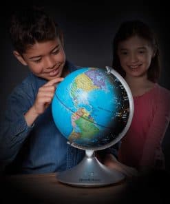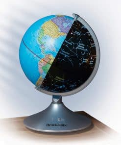 Este increíble globo interactivo de Brookstone para niños es un globo terráqueo, luz nocturna y globo de constelaciones en uno! Aprende sobre geografía descubriendo océanos, países, ríos, desiertos y montañas durante el día, luego explora estrellas, constelaciones, el camino elíptico y planetas por la noche. Se convierte en un mapa iluminado de las estrellas y constelaciones en la oscuridad, por lo que también funciona como una luz nocturna. Simplemente enciéndelo por la noche con solo presionar un botón y comienza a aprender sobre astronomía de una manera divertida. Se incluye una guía educativa sobre las estrellas. El globo mide 14.5 pulgadas de alto con un diámetro de 9 pulgadas, por lo que es el tamaño perfecto para escritorios, tocadores y mesitas de noche. Se apoya en un soporte de plástico estable que no se romperá ni se volcará, y gira 360 grados. ¡Regala el regalo del aprendizaje para Navidad, días festivos o cumpleaños! ¡No hay cables ni enchufes de los que preocuparte! El globo requiere 4 baterías C, no incluidas. También funciona con un adaptador de DC 6V, no incluido.