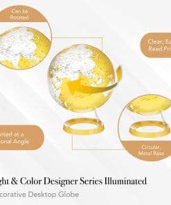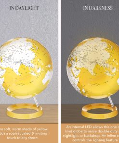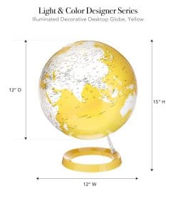 El Globo Designer Series de Waypoint Geographic Light and Color es una impresionante obra de arte que fusiona maravillosamente los mundos de la geografía y el diseño. Este exclusivo globo del mundo está diseñado para dejar una impresión duradera y elevar el estilo de cualquier espacio interior. El globo premium de 12 pulgadas está montado en una base circular de policarbonato con montaje de inclinación de metal, posicionado en un ángulo diagonal, lo que lo convierte en una adición perfecta a estanterías, escritorios o mesas. El elegante color amarillo del globo complementa cualquier decoración interior, y su estilo minimalista lo convierte en una elección ideal para aquellos que aprecian una estética cálida y un enfoque artístico único hacia la geografía. La iluminación integrada, alimentada por una luz LED interna, agrega un brillo acogedor y cálido a cualquier habitación. El interruptor de encendido/apagado en línea y el cable de alimentación están convenientemente ubicados cerca del polo sur del globo iluminado, lo que los hace fáciles de controlar y acceder. El esquema de color amarillo monocromático irradia sofisticación, mientras que el diseño elegante del globo iluminado lo convierte en un centro cautivador para cualquier habitación. Es uno de los hallazgos más interesantes para aquellos que buscan agregar un toque de elegancia a la decoración de su hogar u oficina.