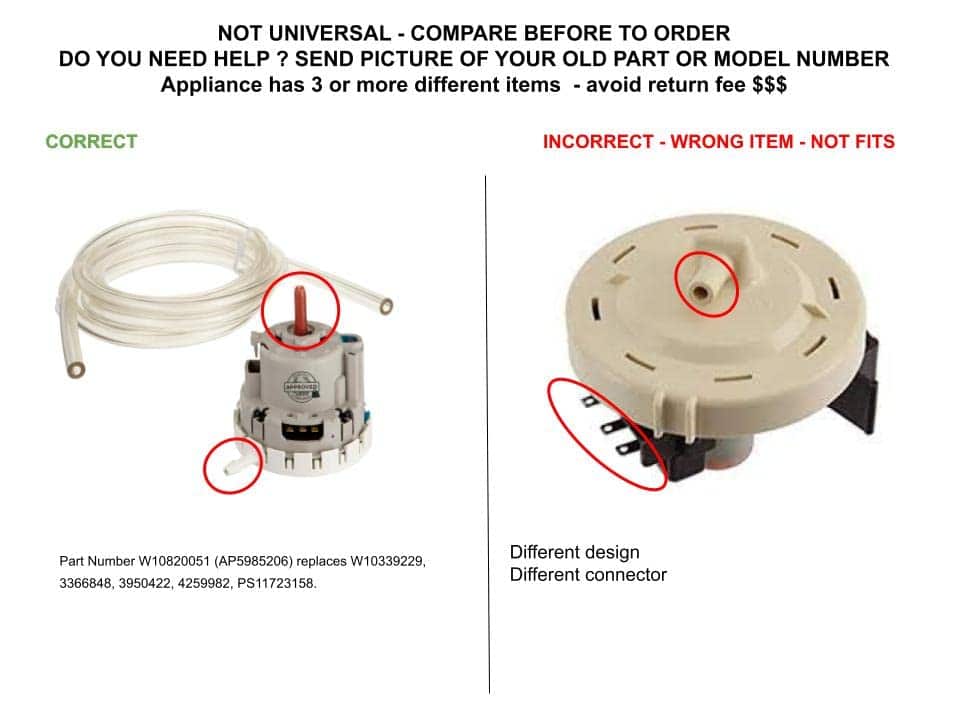 GlobPro W10820051 Interruptor de Presión del Nivel de Agua para Lavadora 3″ grande Aprox. Repuesto para y compatible con Whirlpool Kenmore KitchenAid W10820051 Heavy DUTY. Soluciones Glob Pro con modelos de 110 voltios o 120 voltios para modelos de EE. UU. y Canadá: LSR7333PQ0 LSR5233EQ2 RAS7133PQ0 LSQ8243HZ0 LSQ7533JQ1 y más. Compatible con y reemplazo para Whirlpool Kenmore KitchenAid / NON OEM y ajuste perfecto para modelos antiguos y nuevos. Este interruptor de presión del nivel de agua es un ajuste perfecto, no necesita cables adicionales, terminales o pegamento, trabajo fácil de 15 minutos en promedio, Parte de reemplazo universal NON OEM con estándares OEM, reemplazo para y compatible con True, Beverage Air, Plased, Tecumseh, RCA, Estate Whirlpool, Monogram, Maytag GE Kenmore Samsung, Frigidaire, Amana, LG, Miele y más. Estas marcas se utilizan solo a modo de ilustración.