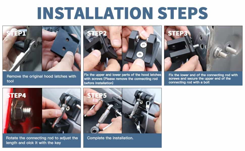 4. BUEN MATERIAL: Hecho de acero inoxidable electroplatado de fundición y aleación de aluminio de alta resistencia. Excelente resistencia al calor y a los arañazos. Mantiene el capó en su lugar incluso en terrenos difíciles, reduciendo los temblores del capó.