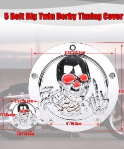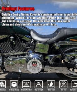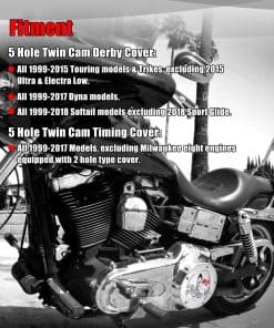 4. Compatibilidad: Las Cubiertas de Tiempo Derby y Cubiertas de Puntos de Goldfire son compatibles con el patrón de 5 orificios Twin cam, como los modelos Evolution 1340 de 1999-2000, Dyna de 1999-2017, Softail de 1999-2018 (excepto FLSB) y los modelos Touring y Trike de 1999-2015 (excepto FLHTCUL, FLHTKL o los modelos Touring o Trike de 2007-2015 con Cubierta Primaria Exterior de Perfil Estrecho P/N 25700385 o 25700438).