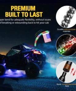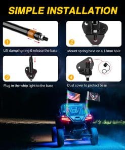 Protección de la Batería: Viene con un interruptor de palanca, eliminando la necesidad de una compra por separado. Al instalar un interruptor de palanca con los látigos de luz UTV, puedes evitar que la batería de tu UTV, ATV, RZR, etc se agote, y operar convenientemente las luces del látigo desde el compartimiento del conductor.