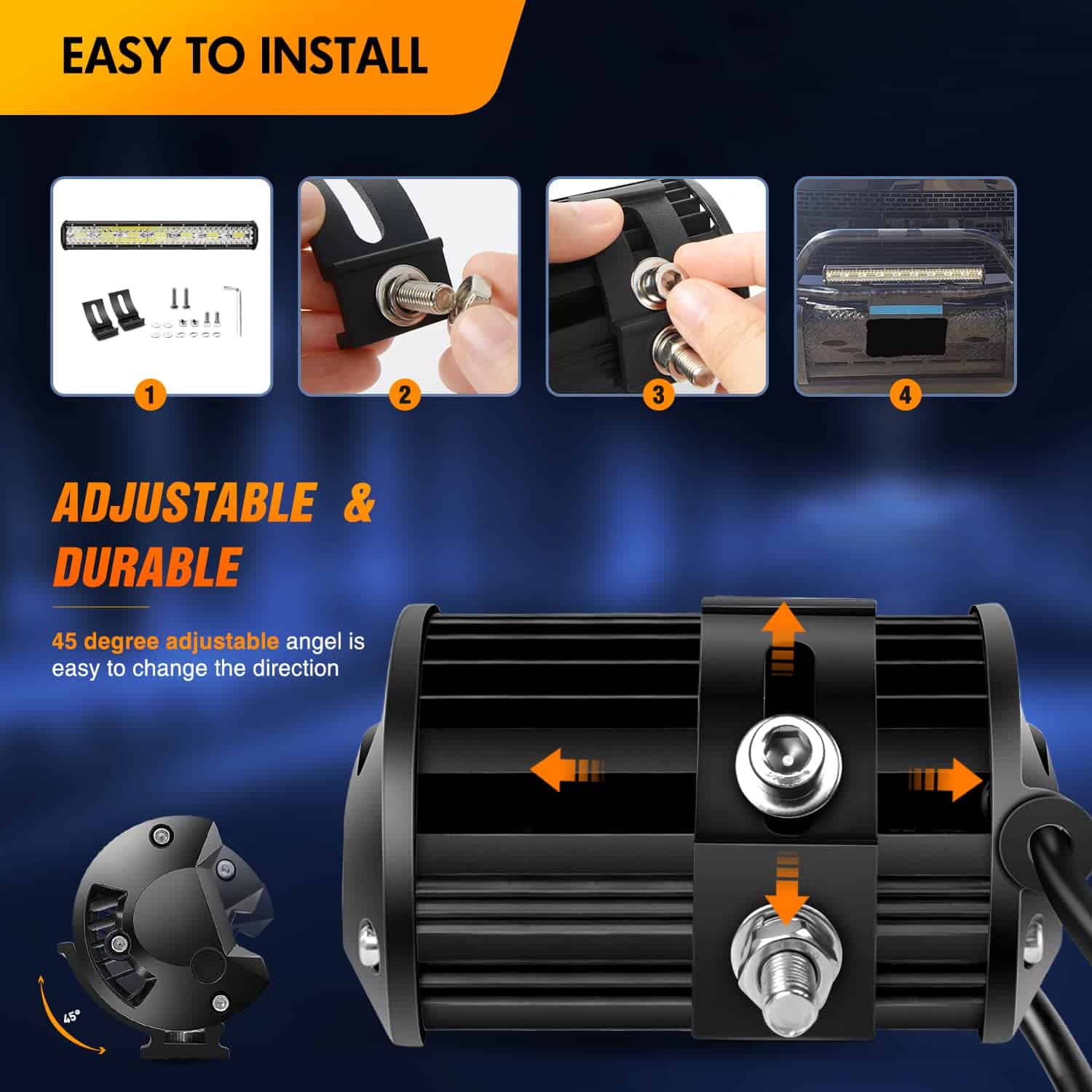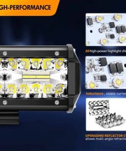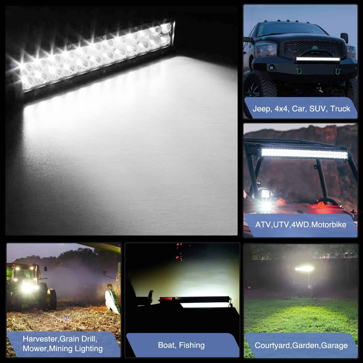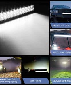Especificaciones: Patrón de haz: Combo de foco de inundación Voltaje de entrada: 9-30V DC (se adapta a vehículos de 12V, 24V). Tasa impermeable: IP67 Vida útil de trabajo: Más de 30,000 horas Material: Perfil de aleación de aluminio 6063, Lente de PC Muchas aplicaciones en interiores y exteriores Iluminación interior: Se puede utilizar como iluminación doméstica como jardín, patio trasero, garaje, iluminación interior, pero recuerde usar un transformador / convertidor de voltaje para convertir el AC 110-120V a DC 12V para uso interior. Iluminación exterior: Se puede utilizar como iluminación todoterreno como luz de marcha atrás, jeeps, 4×4, autos, ATV, UTV, SUV, camioneta, remolque, etc; Iluminación de equipos como remolque, carretilla elevadora, grúa, tractor, cosechadora, sembradora, segadora, quitanieves, etc; Iluminación de embarcaciones: Esta luz Led se puede instalar en barco, yate, bote, buque y barco para aumentar el brillo de la iluminación del viaje. Nota: Antes de instalar este producto, verifique las leyes y regulaciones estatales / provinciales y locales / municipales. Por favor, finalice la instalación con profesionales o instale el arnés de cables bajo la guía de profesionales.