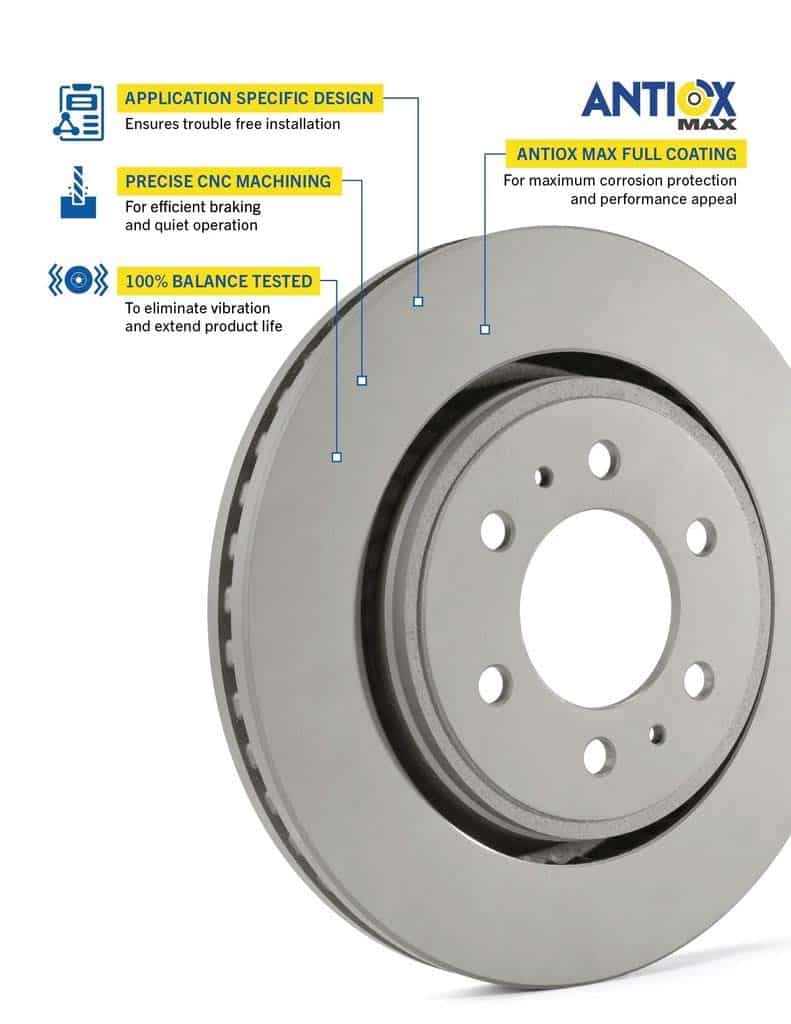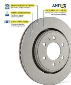 1. Recubrimiento AntiOx Max Para Una Vida Más Larga | Los rotores Goodyear están tratados con un recubrimiento AntiOx patentado para protegerlos de la corrosión y el óxido.
