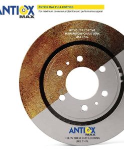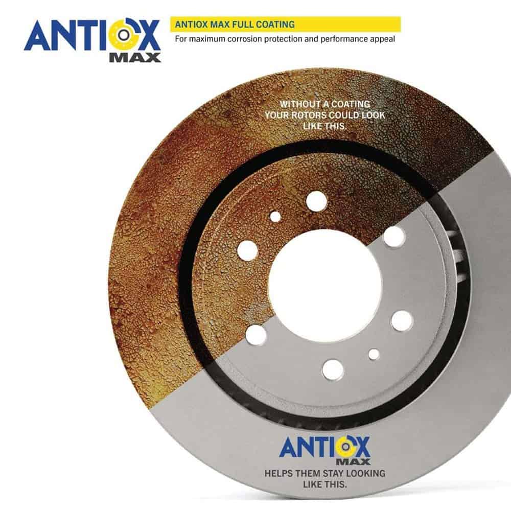 1. Recubrimiento AntiOx Max para una vida útil más larga | Los discos de freno Goodyear están tratados con un recubrimiento AntiOx para protegerlos de la corrosión y el óxido.