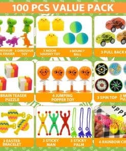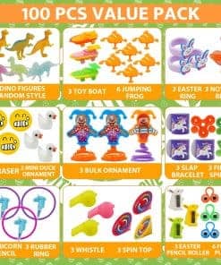 1. Super Value Pack 100 Piezas de Huevos de Juguete Prefilled Premium incluyen 100 Tipos Únicos de juguetes. Todos ellos empacados en una encantadora caja de regalo. Perfectos para regalos de fiesta de Pascua y rellenos de canasta, estos huevos dorados miden 1.7 x 2.3 pulgadas cada uno, ¡prometiendo alegría y emoción sin fin!