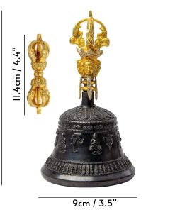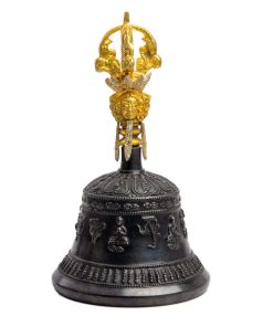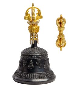 Campana y Dorje de Nepal, hechos a mano por artesanos del Himalaya (el Dorje se llama Vajra en Nepal). La Campana y el Dorje son los principales objetos rituales utilizados en el Budismo Vajrayana (también conocido como Budismo Tántrico). Por lo general, se usan juntos, con uno en cada mano. Se cree que su uso conjunto puede ayudar a alcanzar la iluminación. El sonido de una campana «cantante» también se puede utilizar como punto focal en la meditación.