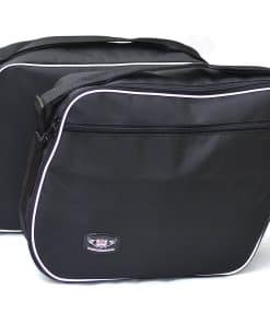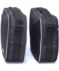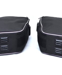 Las bolsas internas pannier están diseñadas a medida para utilizar el espacio máximo y encajar perfectamente dentro de los baúles pannier de HONDA NT1100. Hechas de material resistente de 600 x 600 Denier Polyester Vinyl Laminated PVC y están cosidas a mano con hilo de nailon resistente y cremalleras de primera calidad. Asas de transporte y correa para el hombro para llevar fácilmente las bolsas al alojamiento. Pernos de plástico ABS mantienen la bolsa libre de polvo y abrasiones. Bolsillos exteriores con cremallera para mapas u otros documentos de viaje.