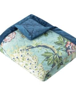 Paraíso encontrado. Rodéate del encanto de un jardín exótico del Edén. Pavona presenta pájaros cantores, mariposas y pavos reales entre enredaderas en flor en un exuberante entorno botánico. Con bordes de terciopelo azul esponjoso, la colcha Pavona se voltea a un color azul sólido en todo. Colcha acolchada a máquina con bordes de tela de terciopelo azul ancho para durabilidad e interés superficial. Dimensiones: La manta mide aproximadamente 50 x 60 pulgadas. Todas las dimensiones +/- 2 pulgadas. Perfecta como una capa adicional para agregar un poco de calor mientras te sientas en tu sofá o en tu porche, esta colcha también sirve como un gran adorno para colgar en la pared. Lavable a máquina. 100% cara de algodón, dorso de microfibra cepillada, relleno de poliéster. Importado.
