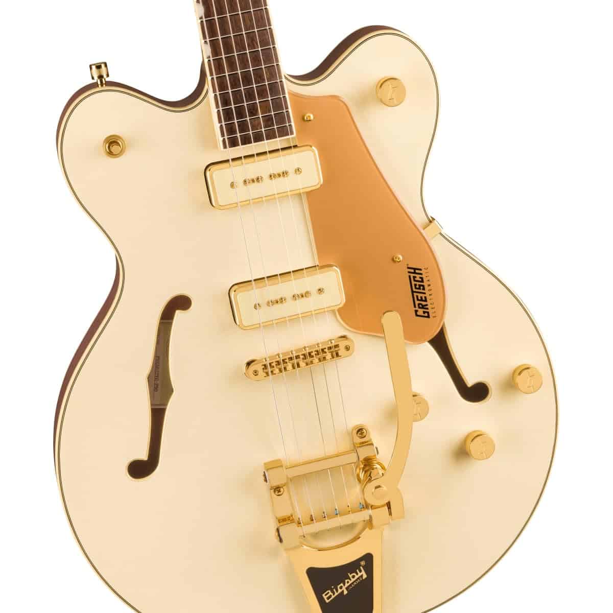 Limpio, elegante y poderoso, las guitarras eléctricas Gretsch Limited Edition Electromatic Pristine Center Block ofrecen potencia y fidelidad de Gretsch en un estilo impresionante. Acabados bicolores con tapas metálicas y cuerpos y mástiles ricos en tono, herrajes dorados y pastillas P-90E con inserciones de crema presentan una opulencia elegante y simple que sin duda atraerá miradas. La Gretsch Electromatic Pristine LTD Center Block cuenta con un cuerpo de caoba de corte doble con un bloque central de abeto a cámara. Tiene un mástil de caoba en forma de U delgado con un diapasón de laurel de radio de 12 pulgadas, 22 trastes medium jumbo y incrustaciones de perlas Neo-Classic thumbnail. El volumen maestro consta de un circuito de sangrado de agudos, tono maestro, controles de volumen individuales para cada pastilla y un interruptor selector de pastillas de tres posiciones. Tiene un Bigsby B70 vibrato tailpiece, un puente Adjusto-Matic anclado y una cejuela Graph Tech NuBone. La guitarra Gretsch Electromatic Pristine LTD está disponible en un acabado Blanco Oro.