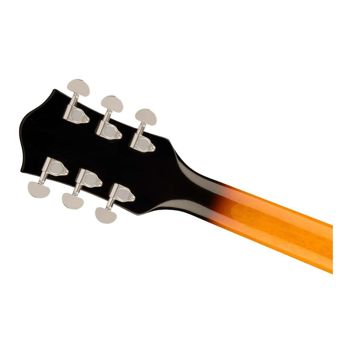 La nueva colección de guitarras eléctricas Gretsch Streamliner revitaliza los mejores elementos del pasado y los combina con emocionantes características nuevas para ofrecer un rendimiento, sonido y estilo excepcionales a un valor increíble. Disponible en un elegante color Aged Brooklyn Burst. Diseño La guitarra eléctrica Gretsch G2420 Streamliner Hollow Body Single-Cut con Chromatic II Tailpiece está diseñada para el guitarrista moderno que ansía algo más allá de lo normal. Una guitarra imponente para músicos potentes, la G2420 ofrece sonidos modernos, electrónica actualizada y estilo auténticamente elegante que crean la última iteración de Ese Gran Sonido Gretsch! Cuerpo hueco de arce arqueado La G2420 Streamliner Hollow Body Single-Cut con Chromatic II Tailpiece cuenta con un cuerpo de arce arqueado completamente hueco con barras de tono paralelas para una plenitud rica, resonancia profunda y un sonido potente. Nuevas pastillas Broad Tron BT-3S La G2420 cuenta con las nuevas pastillas Broad Tron BT-3S. Utilizando una combinación de imanes Alnico 5 y Alnico 2, las nuevas pastillas BT-3S proporcionan medios más fuertes, bajos ajustados pero plenos y agudos suaves y claros que conservan una presencia suave y musical. Controles versátiles con Coil-Splitting El poder sonoro del Streamliner es controlado y conformado por el diseño de controles tradicionales: controles de volumen de las pastillas del mástil y del puente, un control de tono principal, un control de volumen principal y selección de pastillas de tres posiciones. La adición de un potenciómetro push/pull en el control de volumen principal permite dividir las bobinas para proporcionar útiles sonidos de una sola bobina, agregando otra capa de versatilidad tonal a un arsenal sonoro ya robusto.