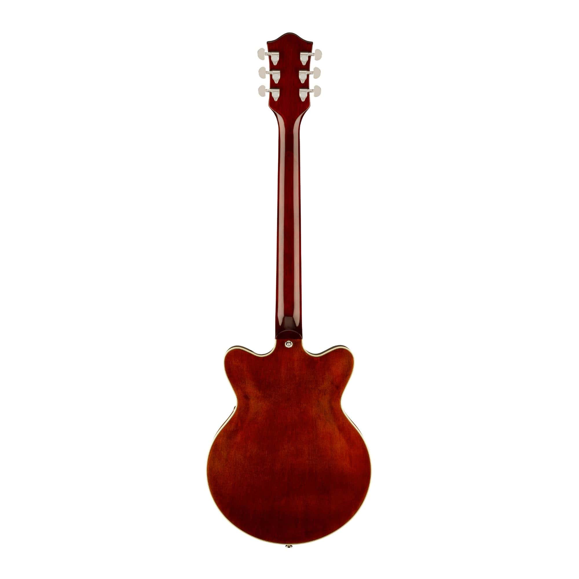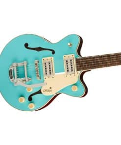 La guitarra Gretsch G2655T Streamliner Center Block Jr. Double-Cut irrumpe en la era moderna con un potente sonido y estilo en un paquete más pequeño. La elegante G2655T está diseñada para el guitarrista que exige más que lo mundano de un instrumento: más rendimiento, más estilo y, lo más importante, más volumen, manteniendo todo lo que esperas de una Gretsch. Esta guitarra derecha de 6 cuerdas está disponible en color Tropico. Cuerpo de arce con Nuevo Diseño de Bloque Central El G2655T Center Block Jr. cuenta con un cuerpo de arce arqueado más pequeño con un nuevo diseño de bloque central bajo el capó. Este nuevo bloque central está diseñado para equilibrar la comodidad ligera con un sonido completo y rico y mayor presencia, lo que resulta en una mayor resistencia y sustain, y excelente rechazo de retroalimentación, todo en un paquete cómodo que no te pesará. Nuevos micrófonos Broad Tron BT-3S El G2655T cuenta con los nuevos micrófonos Broad Tron BT-3S de alta potencia. Utilizando una combinación de imanes de Alnico 5 y Alnico 2, los nuevos micrófonos BT-3S proporcionan medios más fuertes, graves apretados pero completos y agudos claros y suaves que mantienen una presencia suave y musical. Controles Versátiles con División de Bobina La potencia sonora del Streamliner se aprovecha y da forma mediante la disposición tradicional de controles: controles de volumen de pastillas de mástil y puente, control de tono maestro, control de volumen maestro y conmutación de pastillas de tres vías. La adición de un potenciómetro push/pull en el control de volumen maestro permite la división de bobina para proporcionar útiles sonidos de bobina simple, agregando otra capa de versatilidad tonal a un arsenal sonoro ya fuerte.
