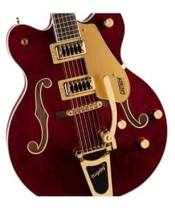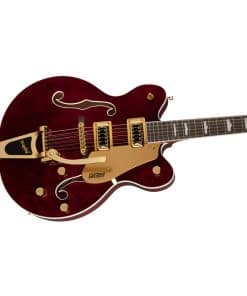Obtén el clásico sonido y estilo Gretsch de los años 50 y 60 con la guitarra Gretsch G5422TG Electromatic Classic Hollow Body. Elaborada con el esencial sonido, estilo y jugabilidad hueca de Gretsch, esta guitarra sin rodeos es tu próxima Gretsch. Cuerpo de Arce La guitarra G5422TG Electromatic Classic Hollow Body Double-Cut con Bigsby y herrajes dorados presenta un cuerpo de arce laminado con perímetros de estilo vintage y arcos refinados, así como refuerzos de bloque de trestle completamente nuevos para ayudar a reducir el feedback no deseado. Diseño de Bloque de Trestle Al aumentar la rigidez y el contacto entre la parte superior y la parte trasera del cuerpo, el nuevo diseño de bloque de trestle también resulta en que el sonido tenga un ataque más rápido con más enfoque, pegada y sustain. Presencia Mejorada Combinada con pastillas FT-5E Filter Tron completamente nuevas, la voz de esta construcción hueca explota con un golpe enorme y lleno de cuerpo, un campanilleo clásico y una presencia, claridad y definición de notas mejoradas. Mástil de Arce en Forma de C Un mástil de arce en forma de C completamente nuevo ofrece una sensación de juego más cómoda para una mejor jugabilidad y rendimiento, y está coronado con un diapasón de laurel de radio de 12 pulgadas. Otras Características Esta G5422TG también presenta un versátil diseño de controles actualizados que incluye volumen maestro con un circuito de sangrado de agudos, tono maestro, controles de volumen individuales de las pastillas y interruptor de palanca de pastilla de tres posiciones, F-holes vinculados de gran tamaño, encuadernación de cuerpo multiplex, pala más pequeña vinculada del estilo tardío de los años 50 G6120, clavijas de afinación estándar de estilo vintage a la vista, cejuela Graph Tech NuBone, incrustaciones de bloque de joroba de perla, puente fijo Adjusto-Matic asegurado y una vibrato Bigsby B60. Acabado Este resplandeciente instrumento viene en un llamativo acabado de Walnut Stain, completo con un pickguard dorado y herrajes dorados.