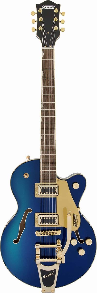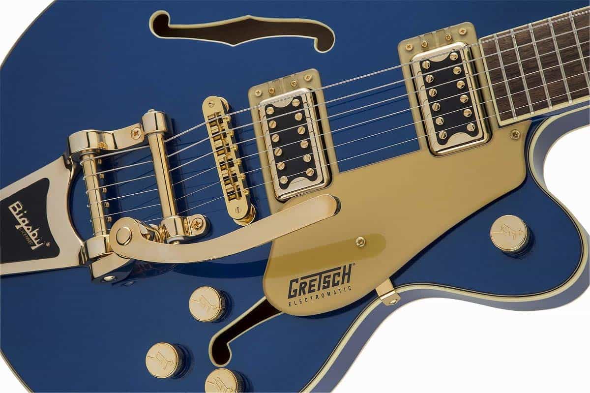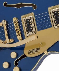 Montones de tono, asombroso sustain y el inconfundible estilo vintage de Gretsch La guitarra eléctrica Gretsch Electromatic G5655TG Center Block Jr. ofrece una amplia gama de tonos ideales para una variedad de estilos musicales. Las pastillas humbucking Black Top Broad’Tron de la G5655TG brindan todo el potencia y mordida necesarios para blues, jazz, rockabilly, indie rock y otros estilos. Un bloque central de abeto cavernoso proporciona un sustento tonal más que suficiente, y un Bigsby B70 vibrato tailpiece le permite doblar las notas de forma suave y uniforme. ¡Enriquece tu colección de guitarras con la Gretsch Electromatic G5655TG Center Block Jr. tipo semi-hollowbody! Los Broad’Trons de Black Top ofrecen un rango tonal enorme Gracias a su par de pastillas humbucking Black Top Broad’Tron, la guitarra semi-hueca Gretsch G5655TG ofrece un rango tonal dinámico y extendido de forma única. La pastilla Black Top Broad’Tron en el puente proporciona el golpe sólido y el brillo que han convertido a los modelos Electromatic en un éxito entre los guitarristas de rockabilly y blues. En