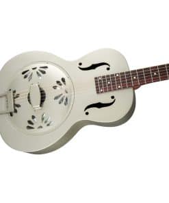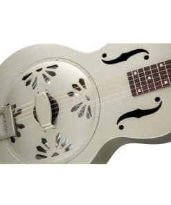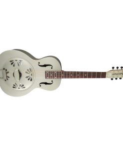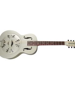 Un solo rasgueo de la Guitarra de Resonador de Seis Cuerdas Gretsch Honey Dipper Round-Neck te transporta 80 años atrás a un bosque de vagabundos cerca de las vías del tren, donde los trabajadores ambulantes se congregan en camaradería y las cautivadoras y reconfortantes notas de una verdadera guitarra de resonador completamente metálica se mezclan con el humo de las fogatas hechas con tambores de aceite y deleitan los oídos con un sonido como gotas de lluvia golpeando un tejado de una casa de bombas oxidada. El sonido y aspecto de esta fina creación de Gretsch te hará desear liberarte de las ataduras de tu oficina, tu cubículo, o lo que sea que te esclaviza, y subir al próximo tren hacia cualquier lugar con una sonrisa tan grande como el cielo y una canción en tu corazón. Diseño excepcional. El G9201 tiene un cuerpo de latón sin corte con un mástil de caoba en forma de V en un acabado vintage de brillo semimate. La guitarra cuenta con una escala de 25 pulgadas y un diapasón de Padauk con trastes medianos-jumbo de 19. Tiene un acabado Weathered Pump House Roof y es ideal para tocar con la mano derecha.