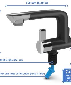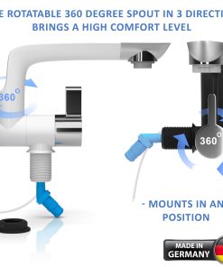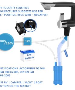 Grifo de Agua Eléctrico de 12V con Interruptor | Ideal para Fregadero de Cocina y Conexión de Bomba en RV, Autocaravana, Remolque, Campervan o Barco (Hasta 1.5 BAR) | Caño Giratorio. Tu solución ideal para un grifo antiguo que gotea en tu Campervan o Remolque. Con 2 cables que no son sensibles a la polaridad, puedes conectar cualquier cable que desees. Solo combina un cable con una bomba sumergible de 12 voltios y otro con una unidad de suministro de energía (batería de coche / convertidor de 130V a 12V, etc.). Más información detallada en la infografía de la imagen. Oportunidades Náuticas/TéRREO. Tiene suficiente presión de hasta 1.5 bares para suministrar agua caliente de hasta 80 °C / 176 °F. Viene en colores BLANCO y NEGRO y tú eliges cuál es más adecuado para tu baño/sala de ducha. Probablemente, el ÚNICO ajuste que tiene un interruptor de microrruptor (3A). Cuando escuches un clic, el grifo con rociador da una orden a una bomba para que empiece a absorber. Calidad alemana excepcional, el ciclo de producción, desde el diseño hasta el empaque, se encuentra en Alemania. La más alta calidad está probada por los certificados ISO 9001 e ISO 14001. El aireador atornillable garantiza una larga vida útil del producto. Un rendimiento excelente con datos de consumo óptimos y un bajo nivel de ruido. Los grifos universalmente aplicables y extremadamente seguros están listos para servirte durante años. Experiencia Exterior/CAMPAMENTO. Cualquier cosa podría pasarle a tu CARAVANA o AUTOCARAVANA mientras descubres nuevos lugares. Lleva contigo una unidad de repuesto para protegerte de cualquier problema de fontanería. Fácil de instalar, te llevará menos de 10 minutos. Puede utilizarse para jardín, casa de campo, necesidades interiores, etc.