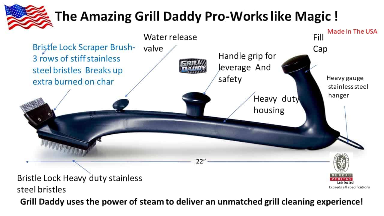 El increíble Grill Daddy Pro libera una cantidad medida de agua que se convierte en vapor que derrite la grasa en el instante en que toca tu parrilla precalentada. Esta acción poderosa de desinfectar y licuar literalmente derrite la acumulación carbonizada. Simplemente desliza el cepillo de acero inoxidable a lo largo de la parrilla. Usa el cepillo de raspador de doble uso para la suciedad resistente y áreas difíciles de limpiar. A diferencia de cualquier otro cepillo, el patentado Grill Daddy Pro está hecho de plástico ABS resistente al calor de alta temperatura y aprobado por la National Safety Foundation (NSF) para ser utilizado con agua potable. Las cabezas de los cepillos son aptas para lavavajillas y seguras para usar en parrillas de acero inoxidable, cerámica y hierro. Grill Daddy Pro es un Must para Parrillas Grandes Antes y después: Grill Daddy Pro te ofrece una parrilla impecable en minutos.