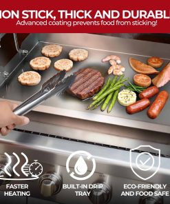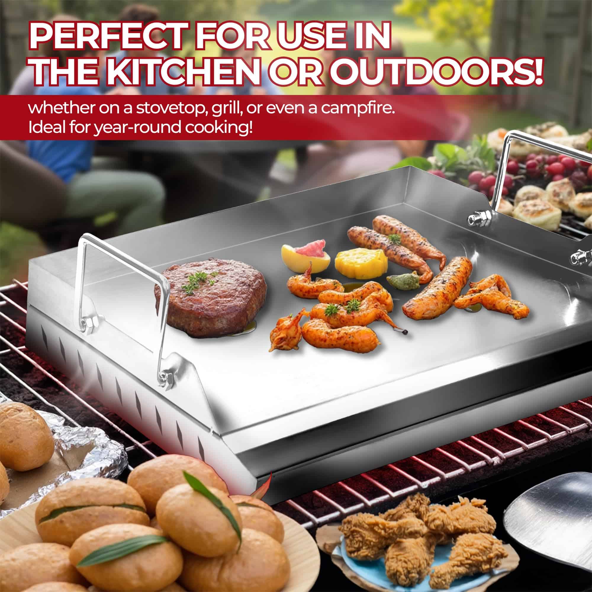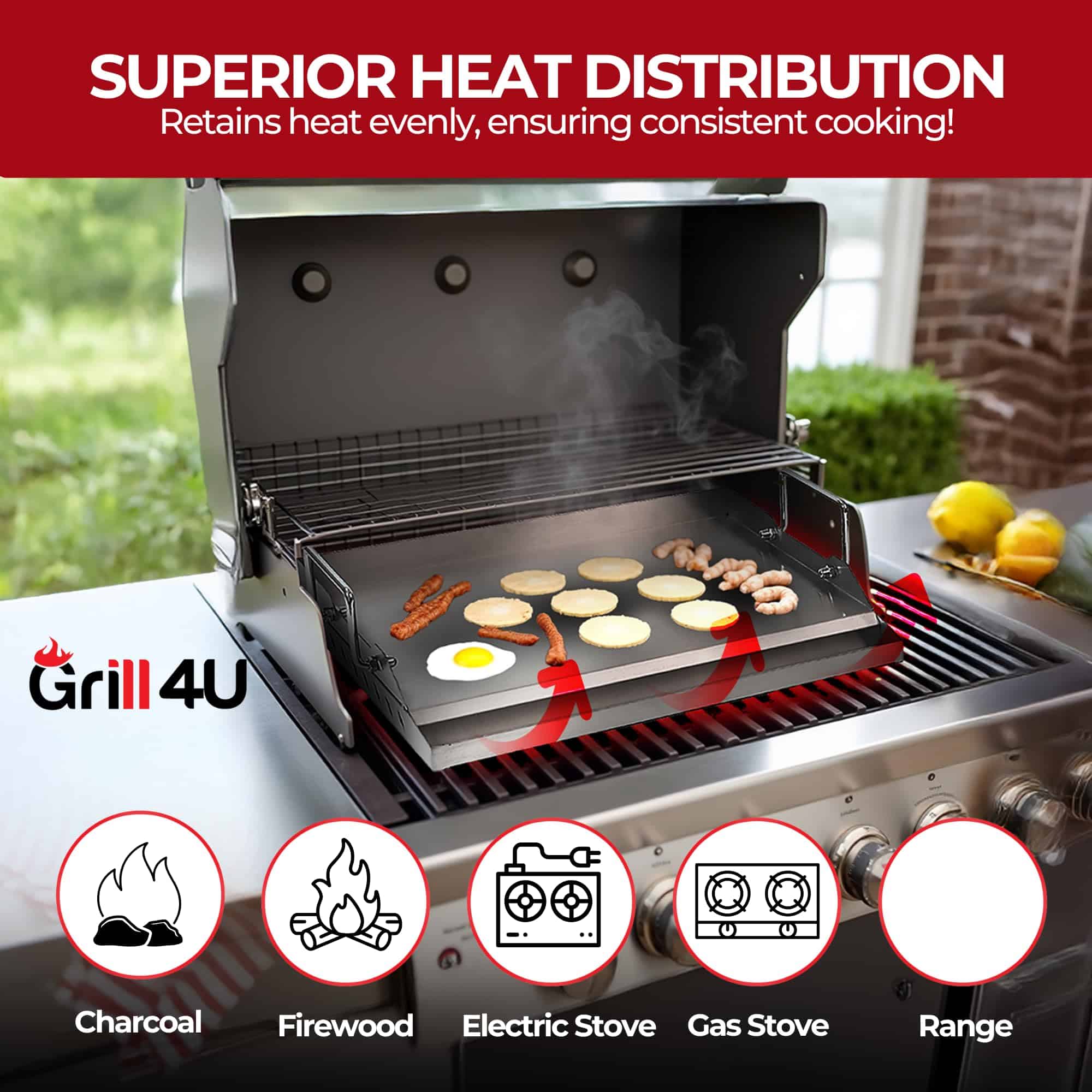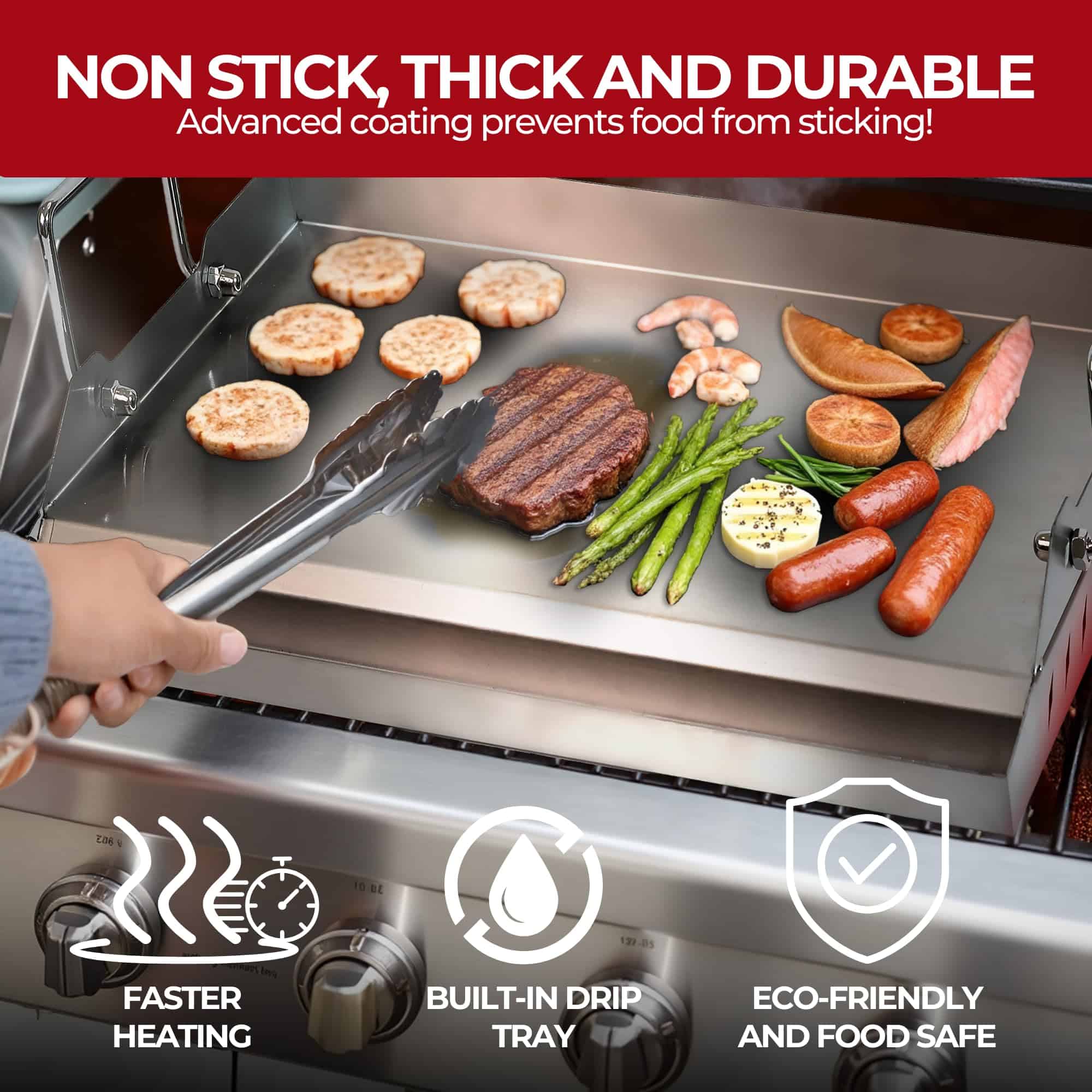 Desata tu maestría en la parrilla con nuestra Plancha de 18″ de Acero al Carbono Antiadherente, esencial para los amantes de las BBQ. Ya sea en una reunión en el patio trasero, en un viaje de campamento familiar, o en una fiesta al aire libre, esta versátil plancha transforma tu parrilla estándar en una máquina de cocina multifuncional. Diseñada para un uso sin problemas en parrillas de gas, parrillas de carbón y parrillas planas para cocina al aire libre, cuenta con un recubrimiento antiadherente premium para cocinar sin esfuerzo y una limpieza rápida. El surco inteligente para la grasa atrapa el aceite y los residuos, garantizando una experiencia de parrilla más limpia y saludable. Con manijas desmontables, ofrece un manejo seguro y un almacenamiento fácil para una conveniencia adicional. Esta plancha universal es compatible con todas las parrillas estándar, convirtiéndola en una herramienta esencial para crear comidas deliciosas en planchas planas, planchas de grill y planchas de hierro fundido para parrillas de gas. Sumérgete en tu próxima aventura en la parrilla con confianza. ¡Feliz parrilla!