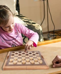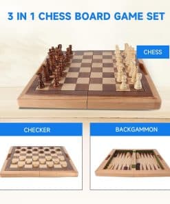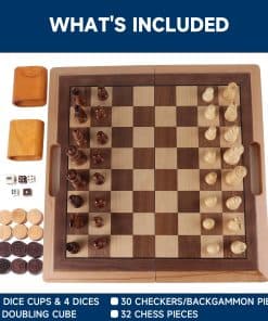 El tablero de ajedrez está hecho de madera maciza, dimensiones abiertas: 16 x 15 3/4 x 1 1/8 pulgadas, dimensiones cerradas: 16 x 8 x 2.4 pulgadas, dimensiones del tablero de ajedrez incrustado de 1 1/2 pulgadas. Superficies de juego para ajedrez, damas y backgammon. Piezas de ajedrez de madera oscura. Rey altura: 3 pulgadas, diámetro de la base: 15/16 pulgadas; Reina altura: 2 3/4 pulgadas, diámetro de la base: 15/16 pulgadas; Peón altura: 1 3/8 pulgadas, diámetro de la base: 3/4 pulgadas. Piezas de backgammon/damas de madera oscura de 15/16 de diámetro. Incluye un tablero de juego plegable, juego completo de 32 piezas de ajedrez, 30 piezas para los juegos de backgammon/damas, dos copas de dados de madera, dos pares de dados y cubo doblador, y todas las instrucciones del juego. El tablero de juego plegable con un agujero para el asa para un fácil almacenamiento y transporte. Para 12 años en adelante. Por favor verifique que las dimensiones se ajusten a sus necesidades antes de comprar. Ideal para escuelas, hogar, viajes, salas de juegos, noche de juegos, oficina y mucho más…