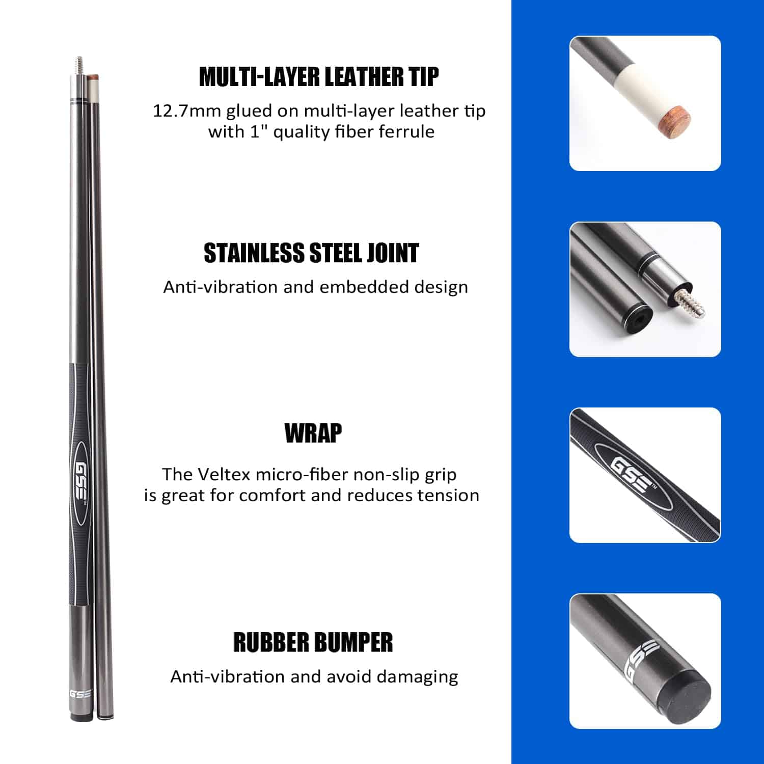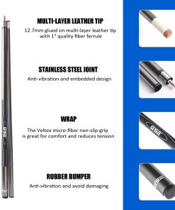 Material: Este taco de billar GSE Games & Sports Expert está fabricado con una mezcla de fibra de vidrio de alta resistencia y compuesto de grafito, lo que lo hace excepcionalmente resistente a la deformidad. La construcción de fibra de vidrio evita que el taco se tuerza, y la superficie del taco cuenta con un acabado de pintura de alto brillo de nueve capas para prevenir la decoloración y deformidad. Calidad: El envoltorio Nano de alta tecnología asegura un contacto cómodo con la mano, además de ser resistente a los arañazos y fácil de limpiar. El taco cuenta con un tope de goma negro que protege de daños cuando se coloca verticalmente en el suelo. Diseño: La punta de 12,7 mm está pegada a varias capas de cuero de alta calidad con virola de fibra de 1″. El sistema de unión de acero inoxidable 3/8-10 con cuello de unión de acero inoxidable y ABS negro liviano garantiza estabilidad y precisión en cada golpe. El diseño del taco de billar de dos piezas facilita su transporte y almacenamiento. Tamaño: El taco de billar GSE Games & Sports Expert mide 58″ de longitud y pesa 18 oz, ideal para adultos practicar y utilizar. Este elegante diseño y material de alta calidad hacen que este taco sea perfecto para mesas de billar profesionales, bares, juegos de billar en el hogar y salas de recreación corporativas.