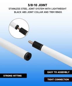 El taco de billar GSE Games & Sports Expert de 58″ es ideal para hombres y mujeres que deseen un taco de billar de alta calidad para uso doméstico o comercial. Está fabricado con fibra de vidrio y compuesto de titanio de alta resistencia, con un acabado en pintura mate. El diseño de dos piezas facilita su transporte y almacenamiento. La construcción de fibra de vidrio hace que este taco sea resistente a la torsión, con una punta de cuero multicapa de 12,7 mm pegada con un ferrule de fibra de 1″ de calidad. El sistema de junta de acero inoxidable 3/8-10 con cuello de junta ABS negro ligero y anillos de adorno garantiza una unión estable. El agarre de microfibra Veltex proporciona comodidad y un buen agarre, y la culata cuenta con un tope de goma negro que protege el taco cuando se coloca en posición vertical. Con una longitud de 58″ y un peso de 19 oz, este taco de billar es perfecto para adultos que buscan mejorar su juego. Adecuado para su uso en mesas de billar profesionales, bares, juegos de billar en casa y salas de recreación corporativas. ¡Ordene ahora y disfrute de la calidad y comodidad que ofrece este excepcional taco de billar de GSE Games & Sports Expert!