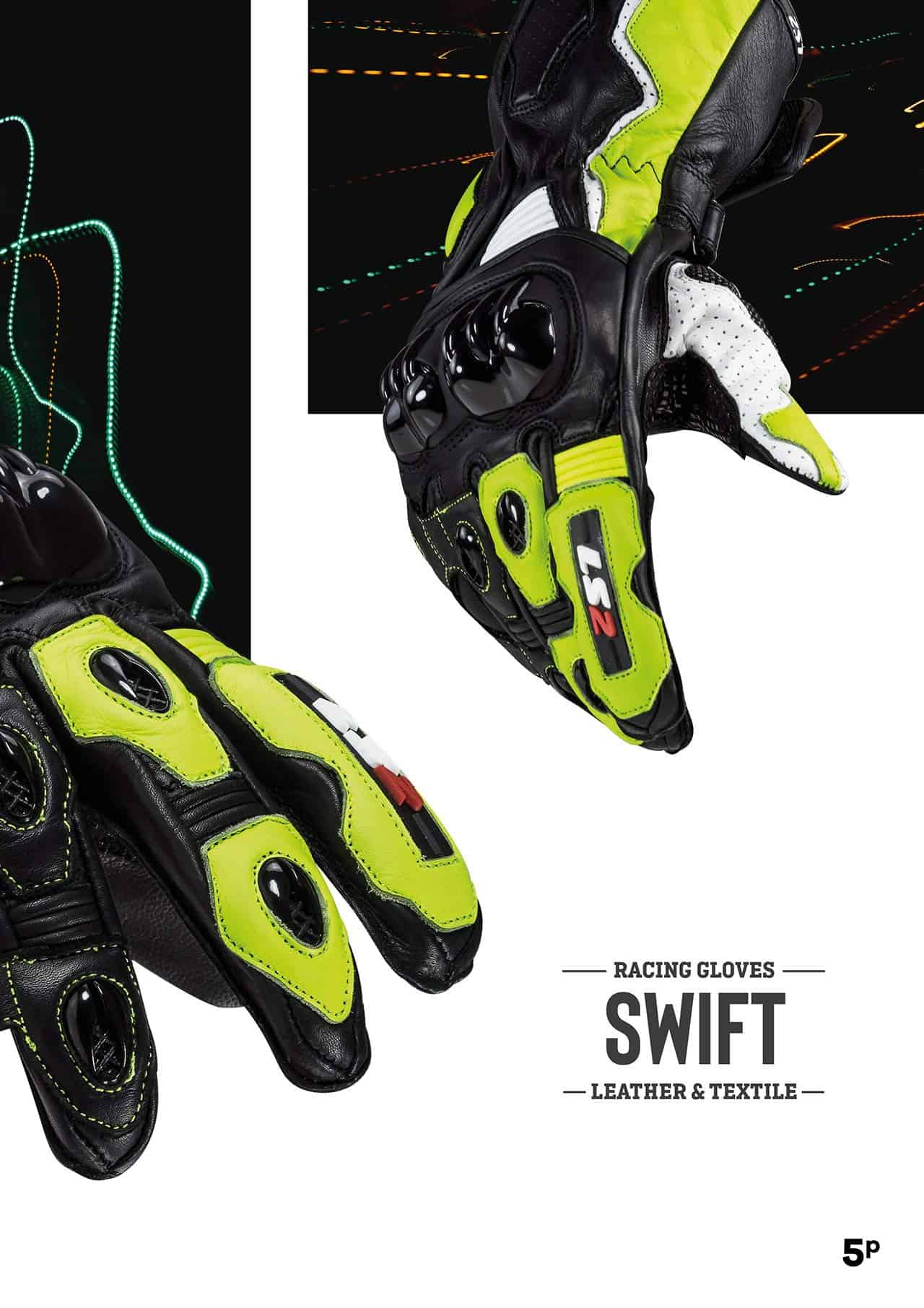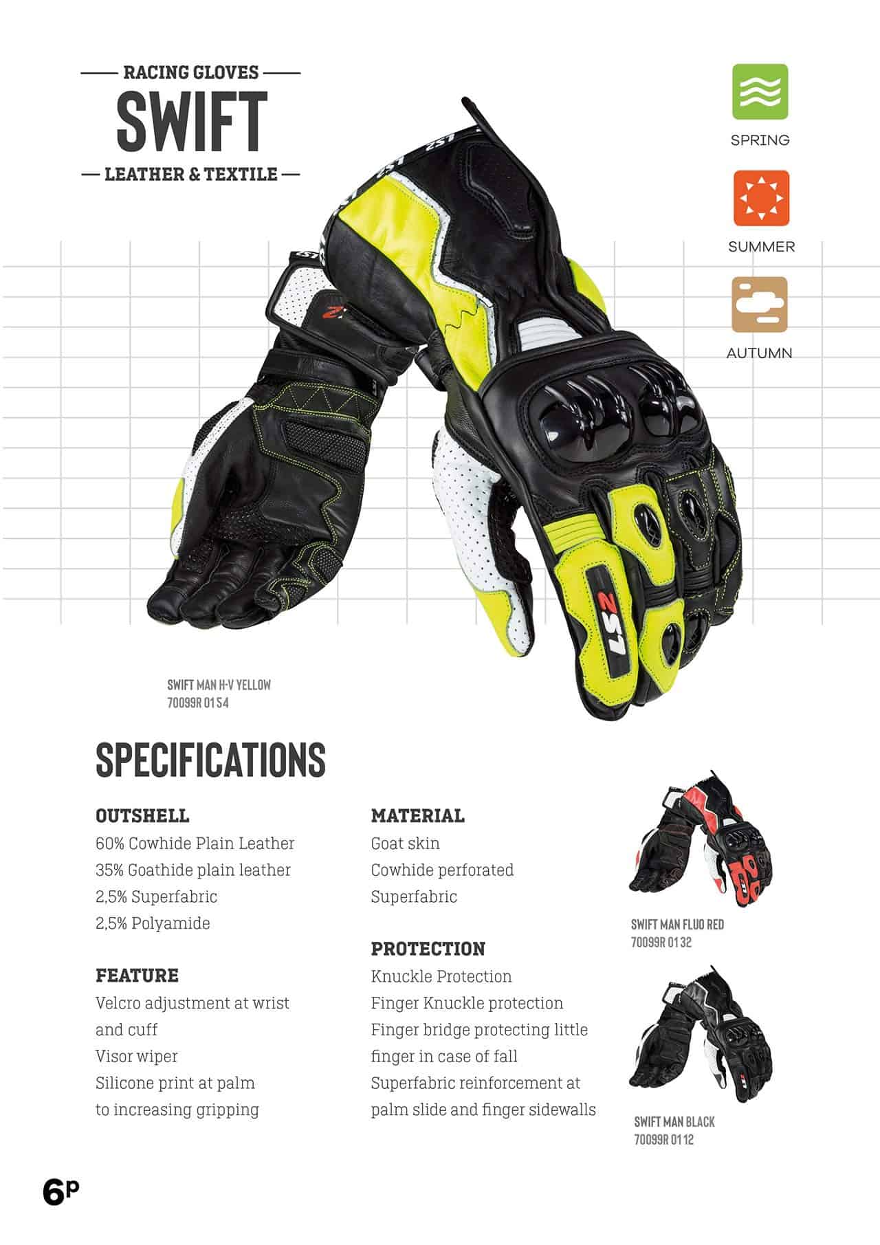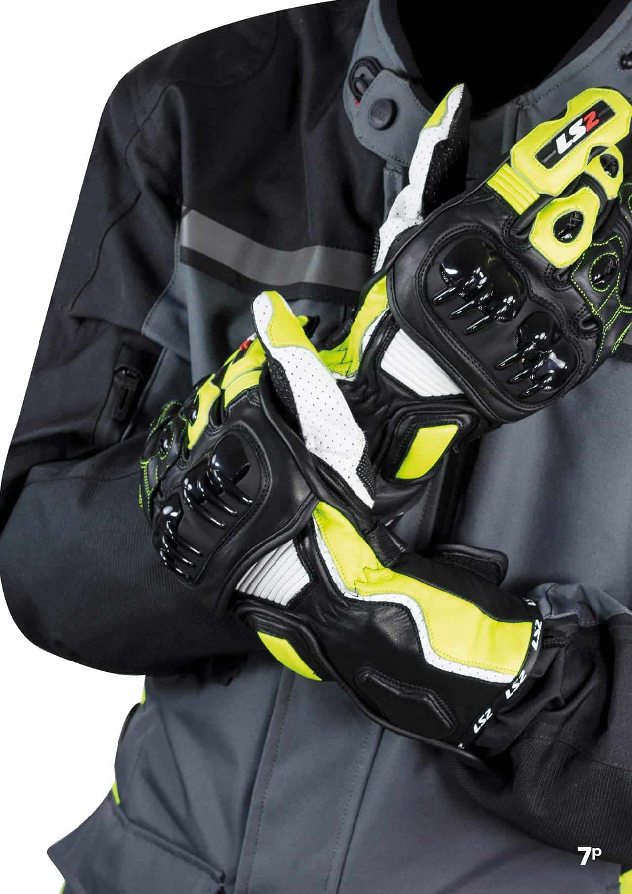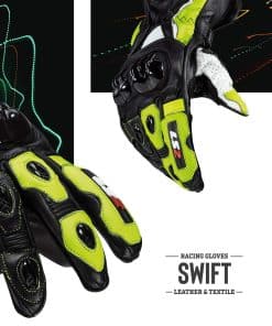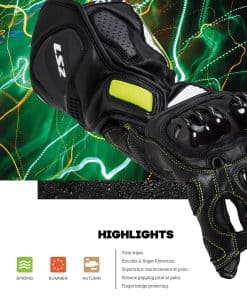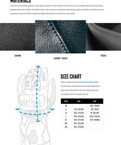 Características: – Impresión de silicona en la palma para aumentar el agarre – Ajuste de velcro en la muñeca y el puño – Limpiador de visera Protección: – Protección de nudillos – Protección de nudillos de los dedos – Puente de los dedos que protege el dedo meñique en caso de caída – Refuerzo de Superfabric en la palma y los laterales de los dedos Destacados: – Ajuste de velcro en el puño – Protección de nudillos de carbono – Refuerzo en la palma y el pulgar – Ventilaciones de PU en los dedos para aumentar el flujo de aire – Dedo compatible con pantallas táctiles Especificaciones: Material: – Piel de cabra – Piel de vaca perforada – Superfabric Exterior: – 60% Piel de vaca lisa – 35% Piel de cabra lisa – 2,5% Superfabric – 2,5% Poliamida