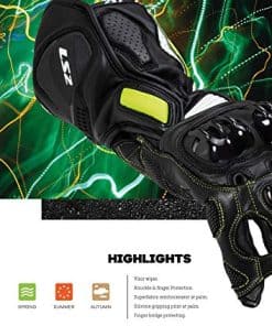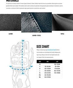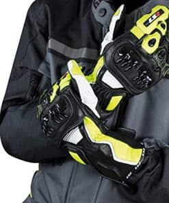 Características: – Silicona en la palma para mayor agarre. – Ajuste de velcro en la muñeca y puño. – Limpiador de visera. Protección: – Protección en nudillos. – Protección en nudillo de los dedos. – Puente del dedo protegiendo el dedo meñique en caso de caída. – Refuerzo de superfabric en palma y laterales de los dedos. Destacados: – Ajuste de velcro en el puño. – Protección de nudillos de carbono. – Refuerzo en la palma y pulgar. – Ventilaciones de PU en los dedos para aumentar el flujo de aire. – Dedo compatible con pantalla táctil. Especificaciones: Material: – Piel de cabra. – Piel de vaca perforada. – Superfabric. Exterior: – 60% Cuero liso de vaca. – 35% Cuero liso de cabra. – 2,5% Superfabric. – 2,5% Poliamida.