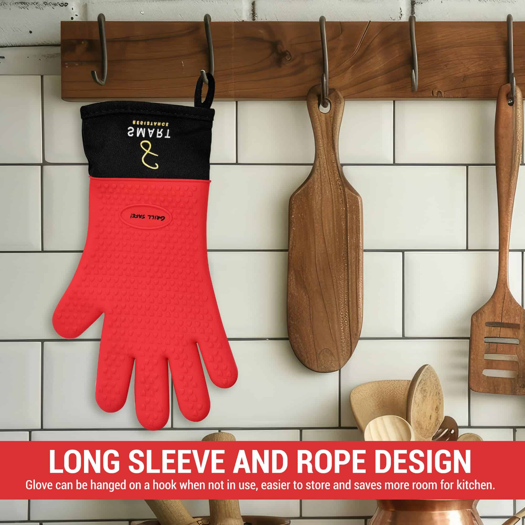 2. DISEÑO – Silicona impermeable de grado alimenticio, manga larga para proteger la muñeca y el brazo y el puño del guante diseñado con una cuerda para colgar en un gancho cuando no se usa.