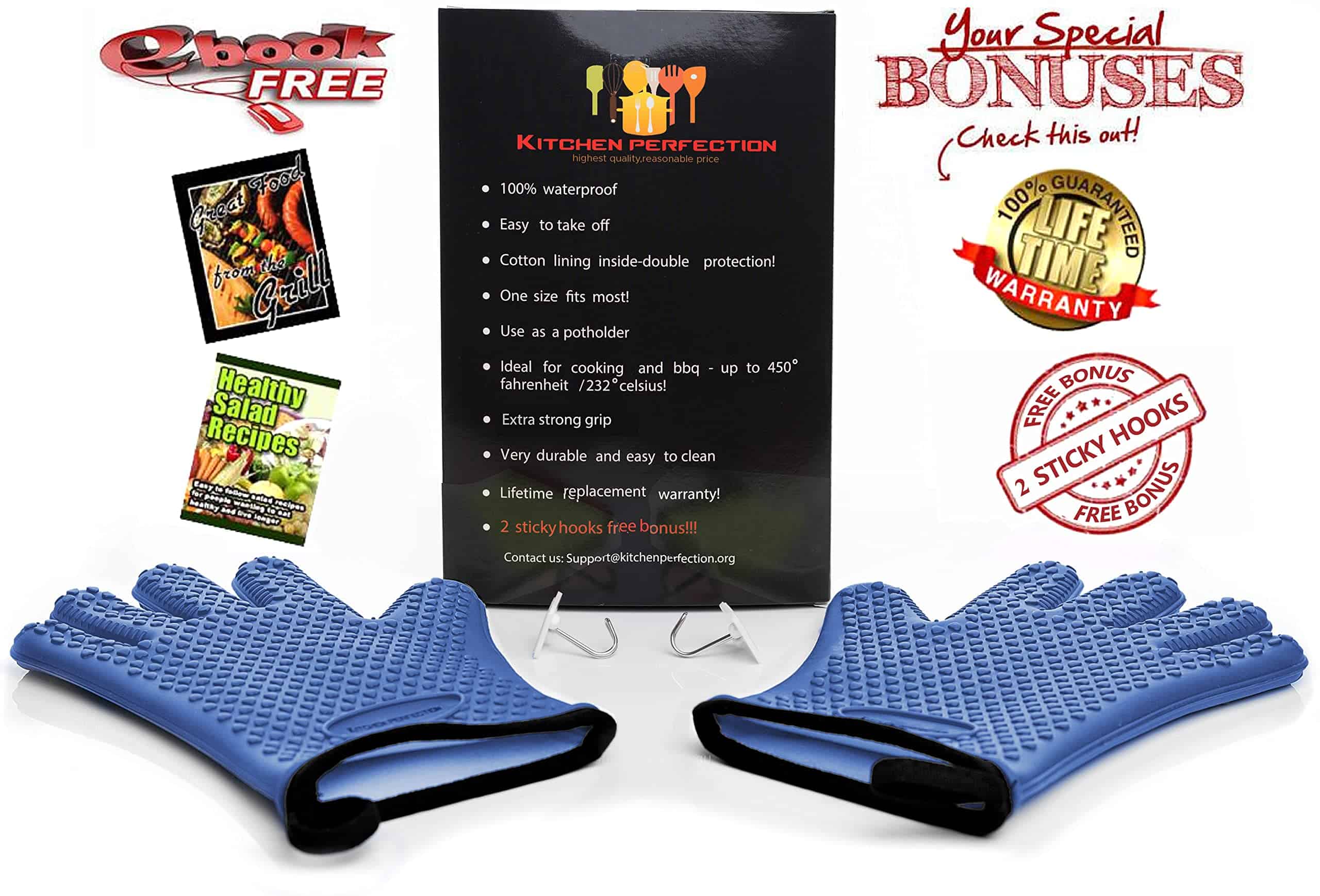 1. Los guantes de cocina KITCHEN PERFECTION XL de silicona son la mejor opción para los amantes de las barbacoas que desean una protección superior al manipular comida caliente. Son duraderos, resistentes al calor extremadamente hasta 500 grados Fahrenheit, están hechos con una capa doble de algodón y silicona impermeable, y ofrecen un aislamiento excepcional que se adapta a manos grandes y pequeñas por igual. Ideales para usar en parrillas de gas y ahumadores como traeger, big green egg, freidoras de pavo, oklahoma joe smoker, camp chef, weber, rec tec, blackstone, pit boss, entre otros.
