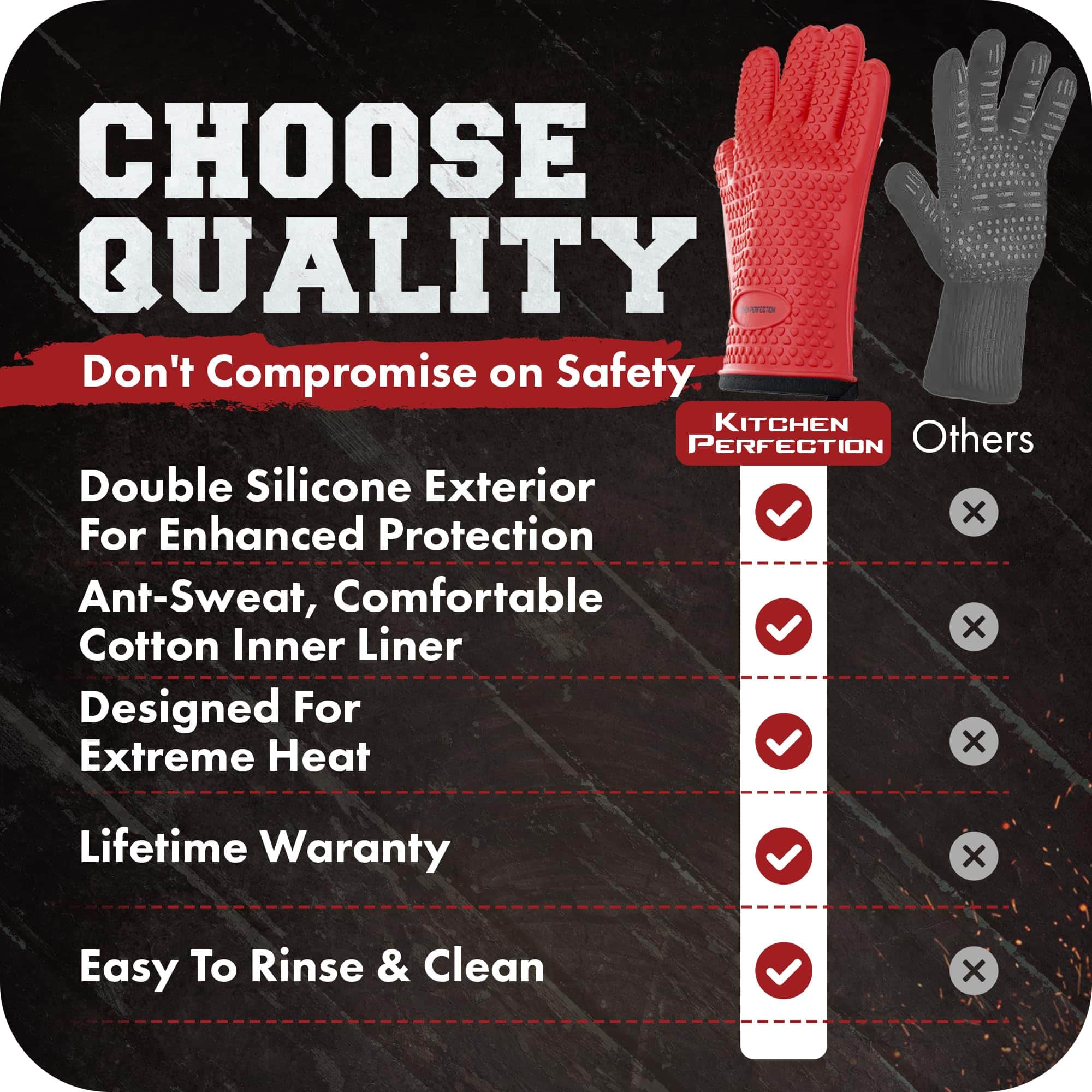 1. Los guantes definitivos para los amantes de la barbacoa. Proteja sus manos al utilizar los guantes de parrilla de 12 pulgadas de Kitchen Perfection, resistentes al calor hasta 500 grados, duraderos, con doble capa de silicona impermeable y de algodón grueso, con una increíble capacidad de aislamiento que se adapta a manos grandes y pequeñas.