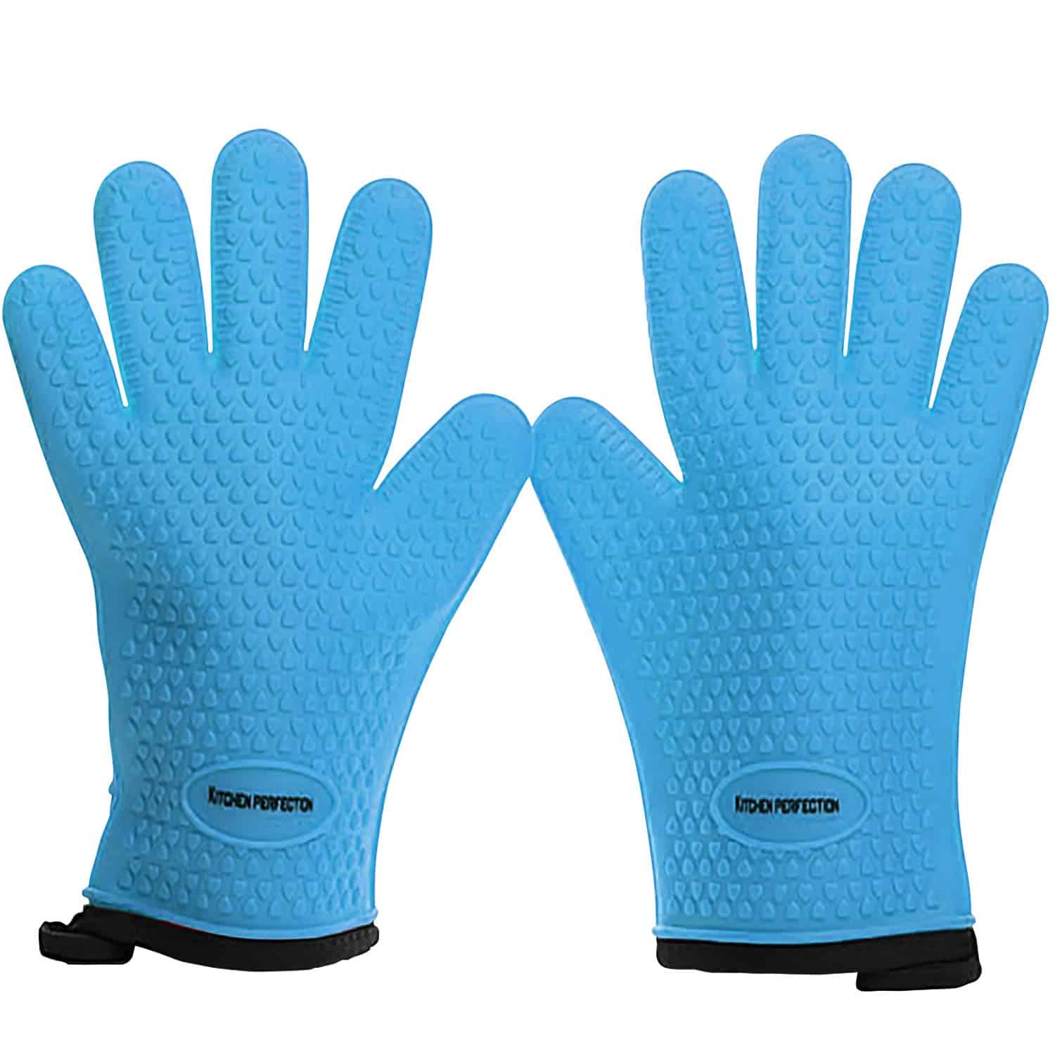 Guantes de Horno para Barbacoa de Silicona de KITCHEN PERFECTION – Azul – Los Guantes Definitivos Para los Amantes de la Barbacoa – No se queme, para su protección use los guantes de parrilla de Kitchen Perfection en Talla Pequeña de 10.6 pulgadas, resistentes hasta 500 grados, capa doble de algodón grueso y silicona impermeable, unos guantes de aislamiento excepcional que se ajustan a manos pequeñas por igual, úselos para su traeger, big green egg, freidora de pavo, ahumador oklahoma joe, camp chef, weber, rec tec, black stone, carbón, pit boss, parrillas de gas pesadas y ahumadores.