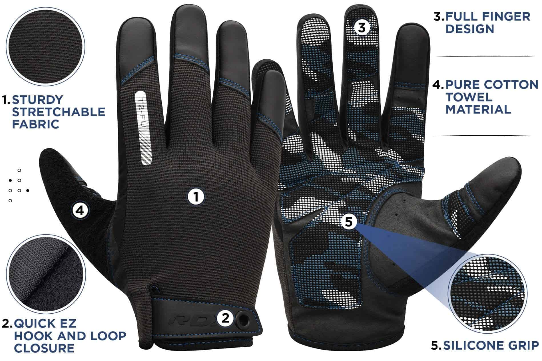 4. TELA ABSORBENTE DE SUDOR Los guantes de gimnasio de fitness tienen agujeros de ventilación para la transpirabilidad junto con tela de toalla estratégicamente colocada en la sección del pulgar que permite a los usuarios absorber el sudor mientras hacen ejercicio.
