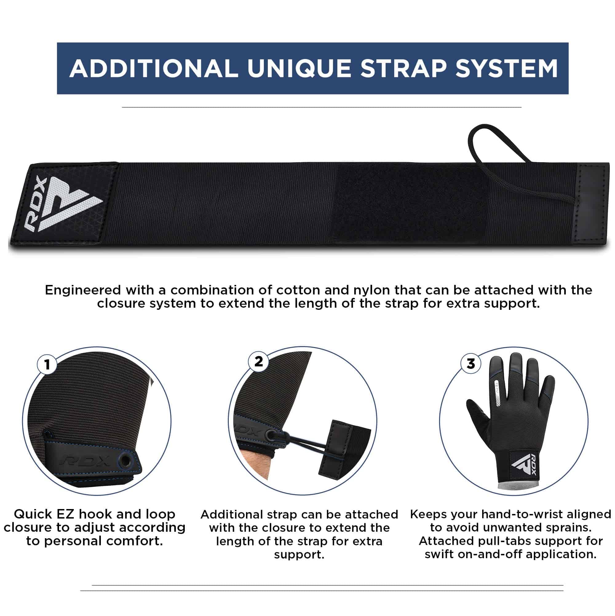 2. CORREA HÍBRIDA ÚNICA Estos guantes de entrenamiento RDX vienen con una correa híbrida desmontable diseñada de forma única. Con la correa más corta, los usuarios pueden controlar sus relojes inteligentes u otras joyas de muñeca durante sus entrenamientos, mientras que la correa adicional de 34 cm de longitud se puede colocar en los guantes de culturismo cuando se trabaja con pesos más pesados donde se necesita más soporte de muñeca.