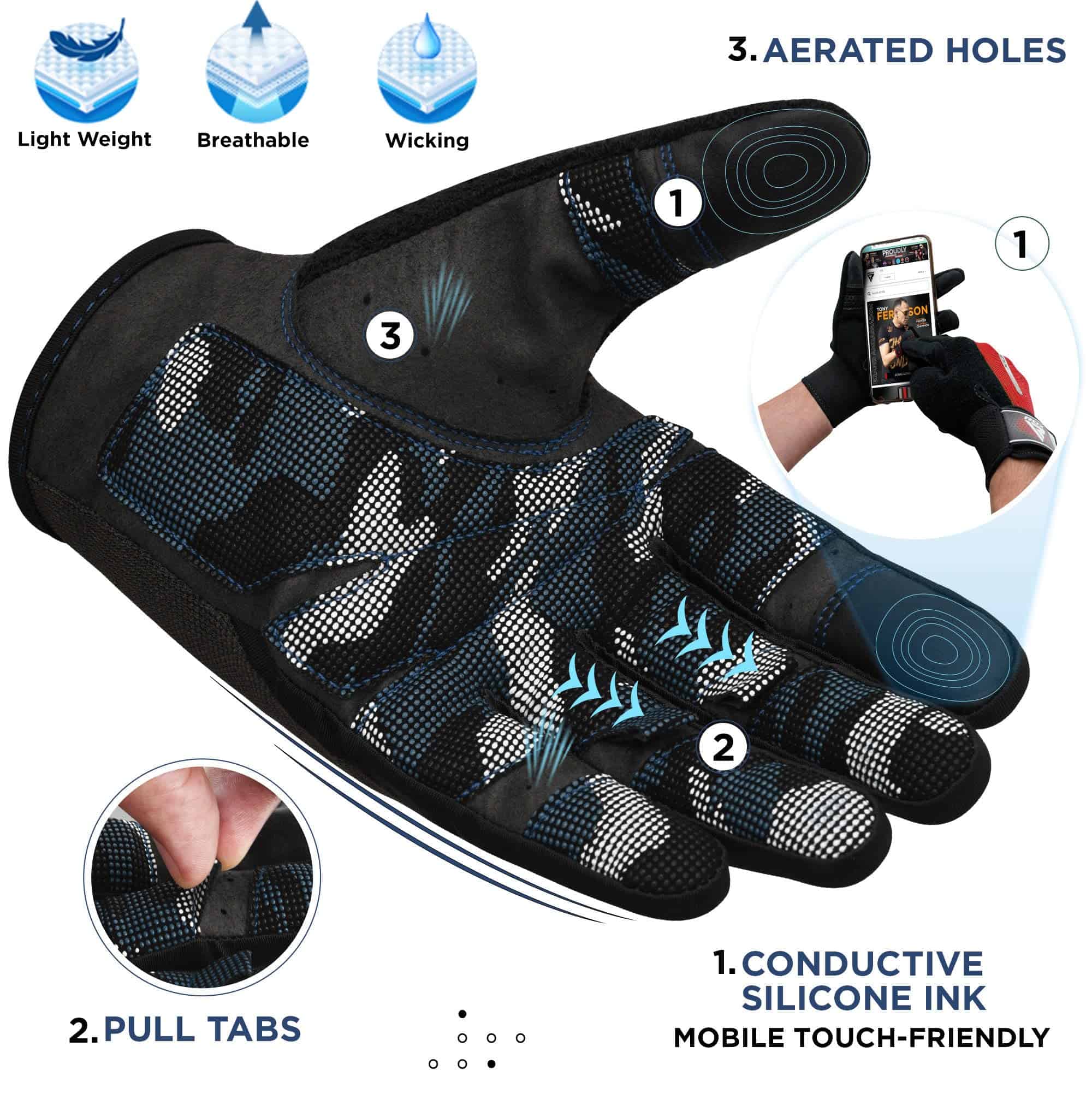 5. AMIGABLE CON LA PANTALLA TÁCTIL Los guantes de levantamiento de pesas utilizan tinta de silicona conductora en las puntas de los dedos del guante que permiten a los usuarios usar sus dispositivos inteligentes sin la necesidad de quitarse los guantes.